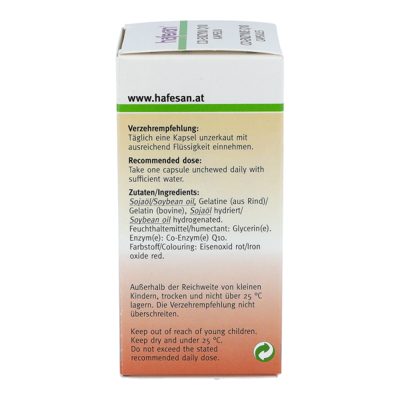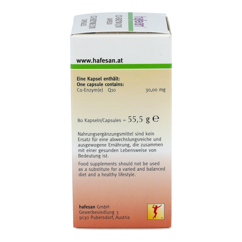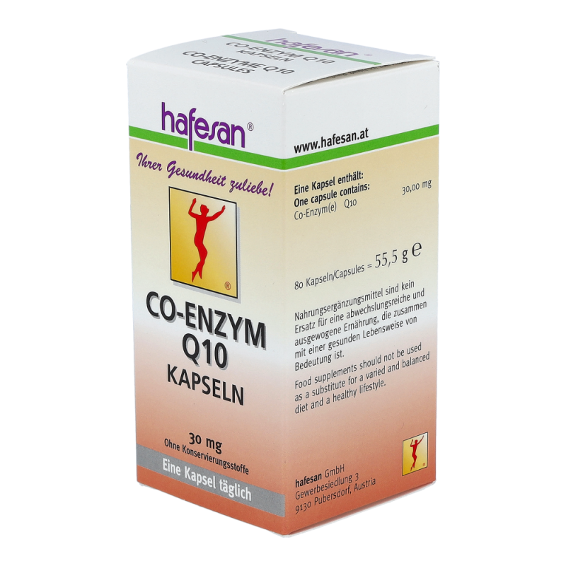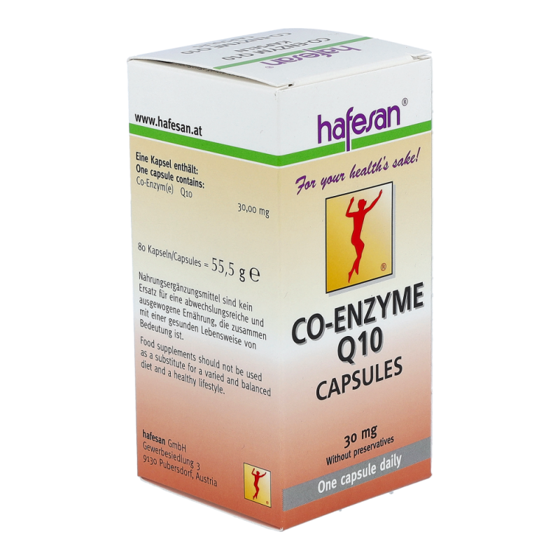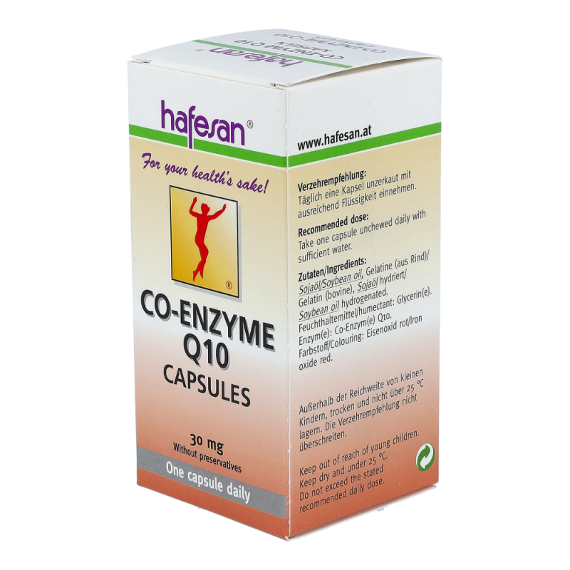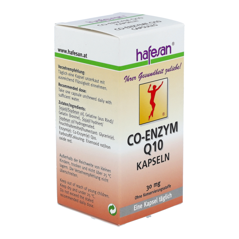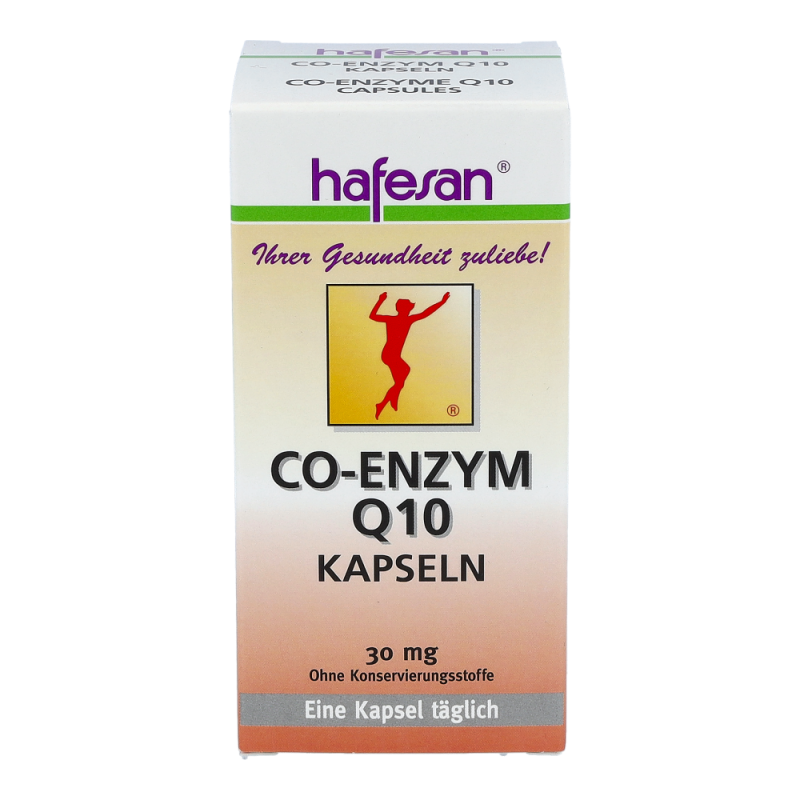 Hafesan® Co-Enzym Q10 30 mg Kapseln enthalten Co-Enzym Q10 welches unentbehrlich für gesunde innere Organe, vor allem für das Herz, ist. Empfohlen ab Mitte 30 sowie in Zeiten erhöhter körperlicher oder geistiger Anstrengung.
