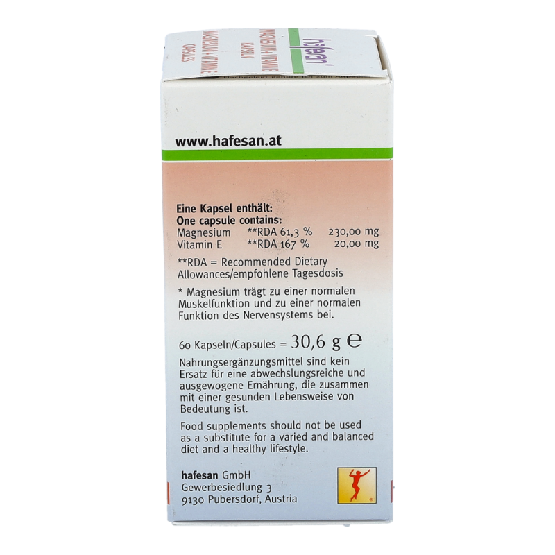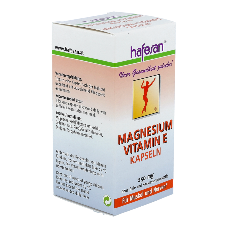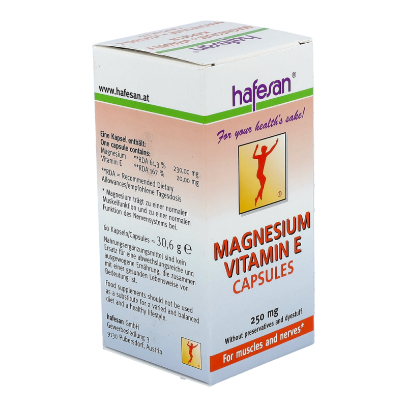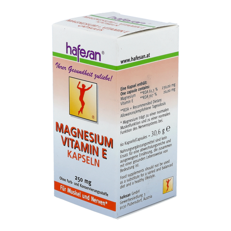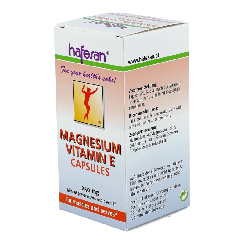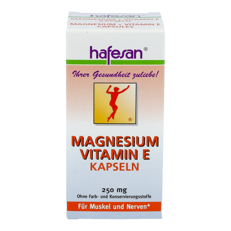 Hafesan® Magnesium Vitamin E Kapseln unterstützen die Funktionsfähigkeit Ihrer Muskeln und Ihres Nervensystems. Sie können Müdigkeit und Erschöpfung verhindern, und schützen Ihre Zellen vor oxidativem Stress.