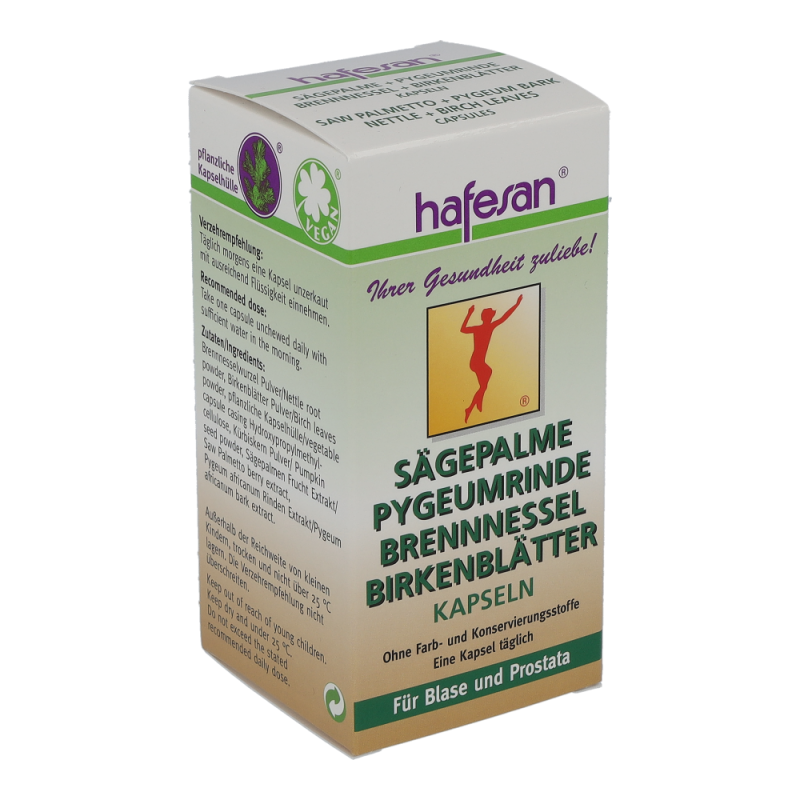 Hafesan® Sägepalme Pygeumrinde Brennnessel Birkenblätter Kapseln beugen verstärktem Harndrang in der Nacht und einem schwachen Harnstrahl vor. Sie pflegen Harn- und Geschlechtsorgane und tragen zu einer Stärkung der Blasenmuskulatur bei.