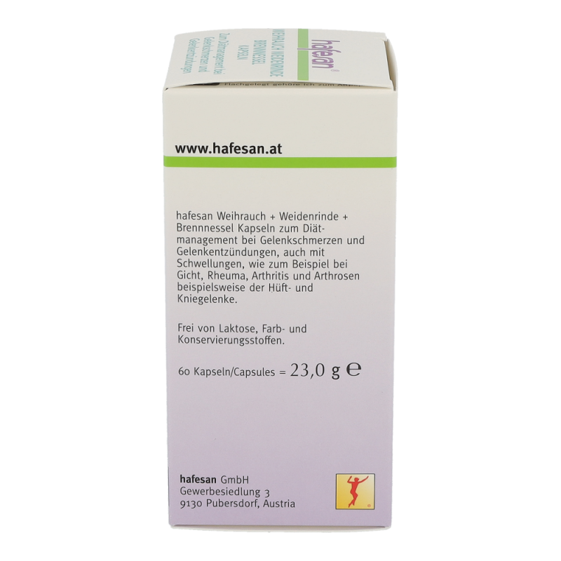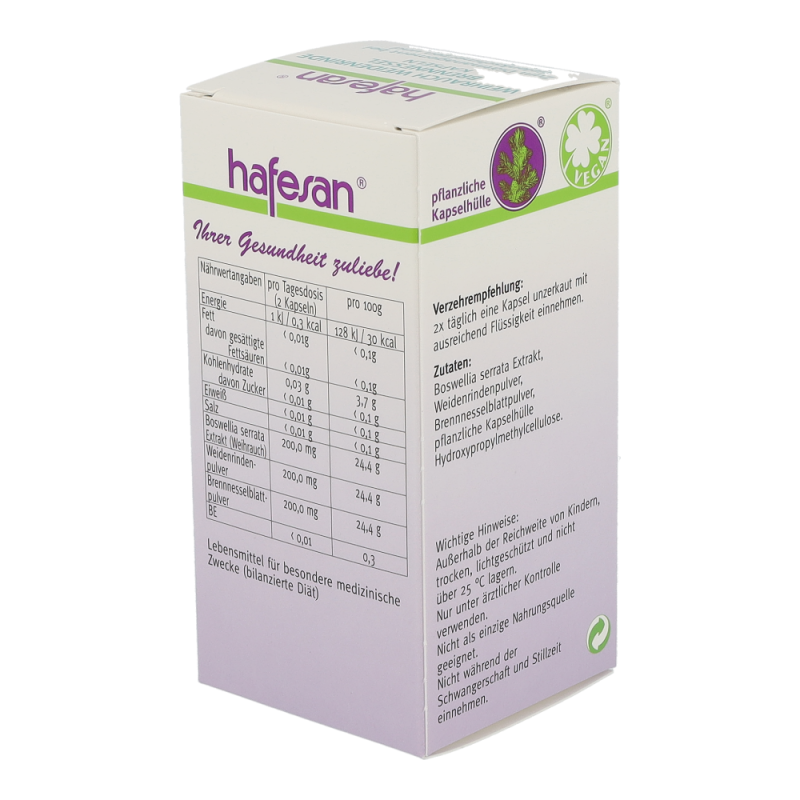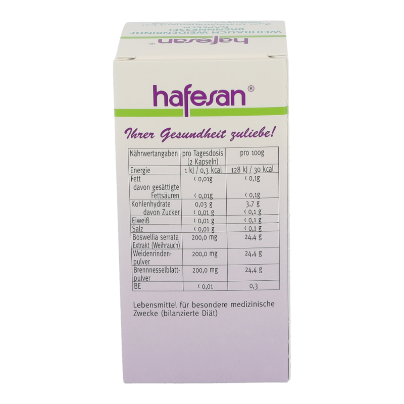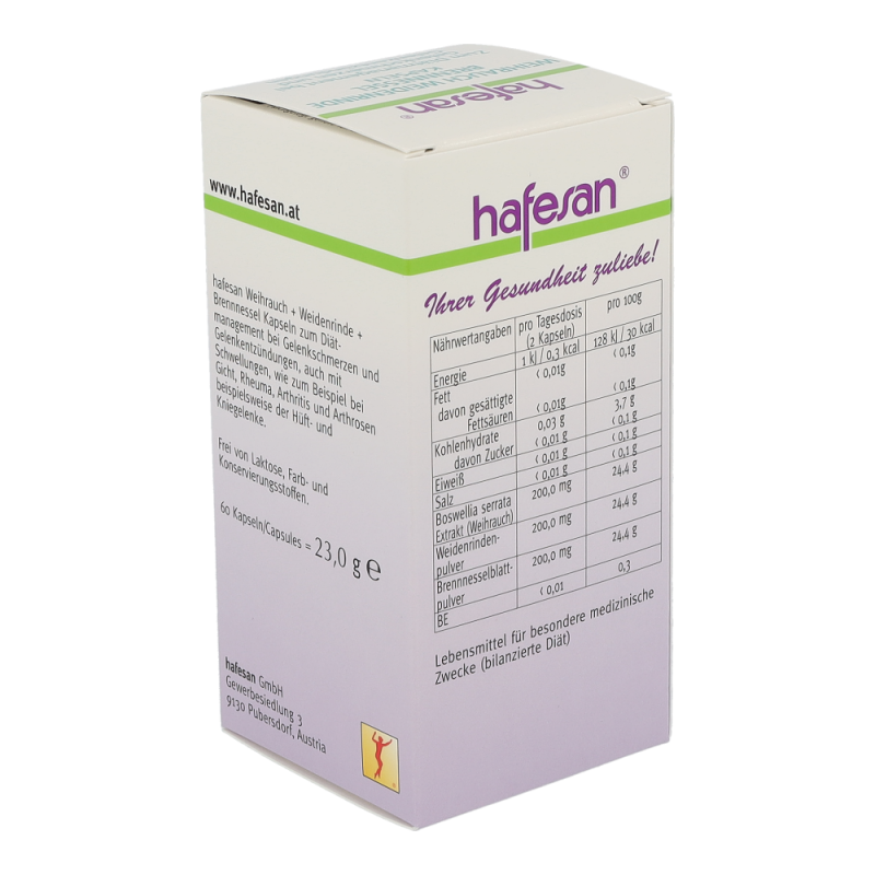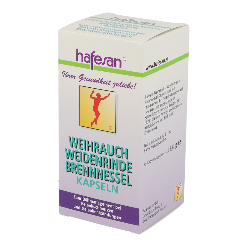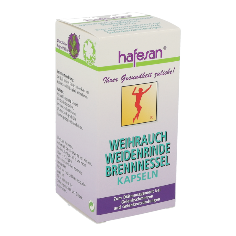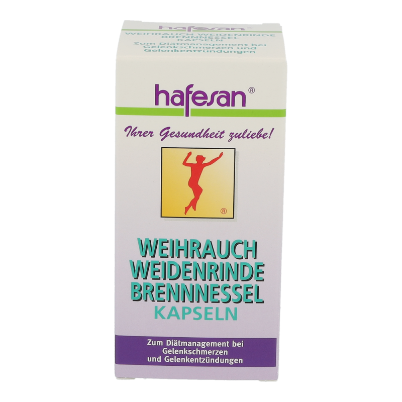 Hafesan Weihrauch + Weidenrinde + Brennessel Kapseln zur diätetischen Behandlung von Gelenkschmerzen und Gelenkentzündungen.