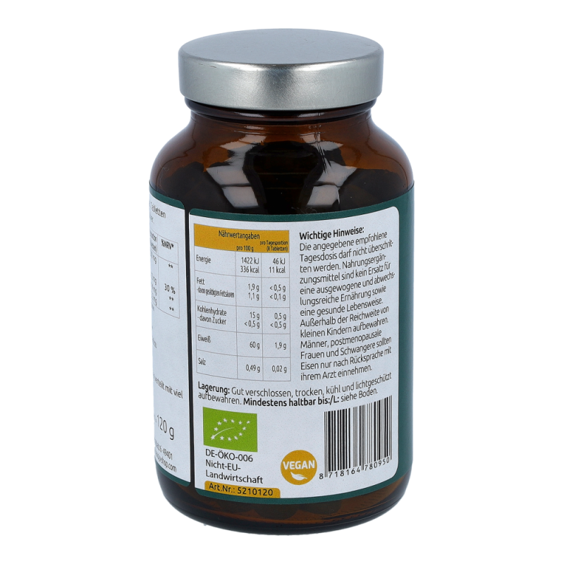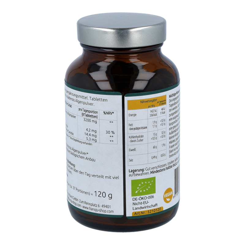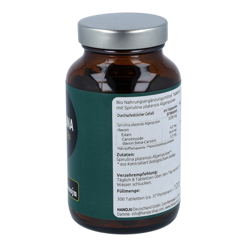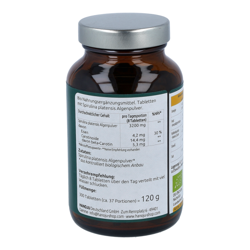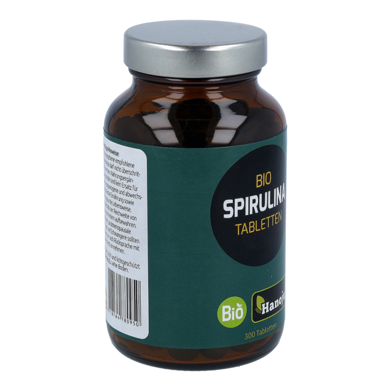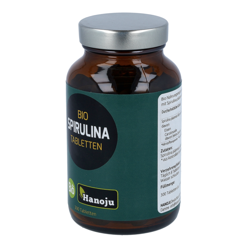 Hanoju Bio Spirulina Tabletten 400 mg ist ein Nahrungsergänzungsmittel aus der Spirulina Alge.Das Produkt enthält ausschließlich biologische Inhaltsstoffe.