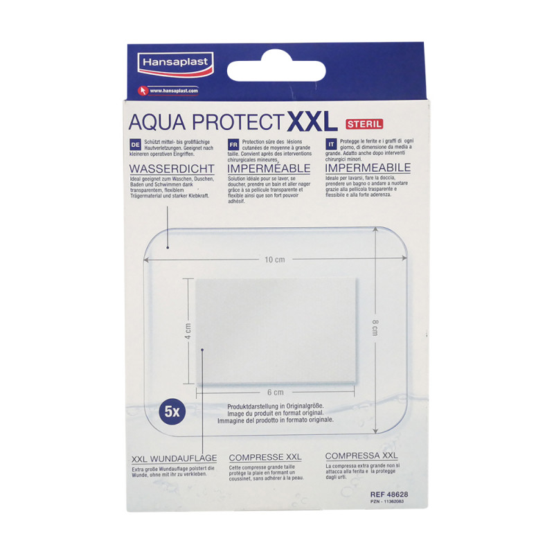 Hansaton Aqua protect XXL Pflaster ist ein wasserdichtes, steriles Pflaster, welches sich perfekt für große Wunden eignet. Es ist besonders hautfreundlich, reduziert das Infektionsrisiko und eignet sich besonders beim Waschen, Duschen, Baden oder Schwimmen.