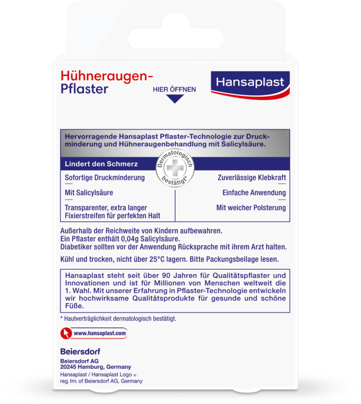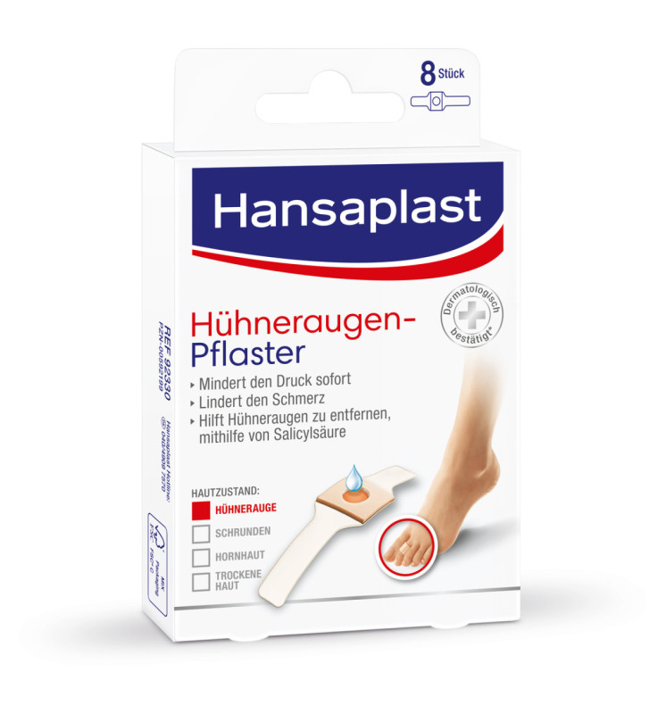 Hansaplast Hühneraugen-Pflaster lindert sofort den Schmerz durch Druck und Reibung und hilft Hühneraugen zu entfernen. Der integrierte Schaumstoffring  befreit den betroffenen Bereich sofort von Druck und Reibung. Die Salicylsäure, die sich in der Mitte des Schaumstoffringes befindet, weicht die verhornte Haut auf. Nach 4 Tagen kann das Hühnerauge in einem warmen Seifen- oder Kochsalzbad entfernt werden.