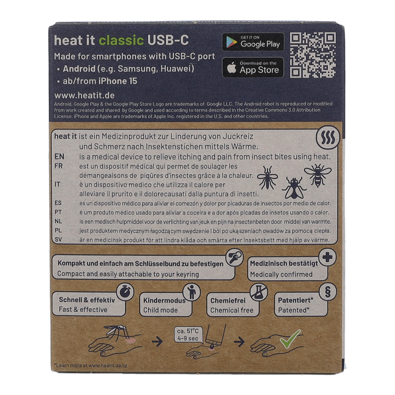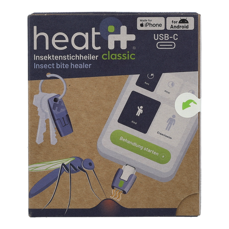 heat it® ist ein Medizinprodukt zur Linderung von Juckreiz & Schmerz bei Insektenstichen. Durch die Behandlung mittels Wärme können juckende Stiche schnell und unkompliziert mit dem Smartphone gelindert werden.