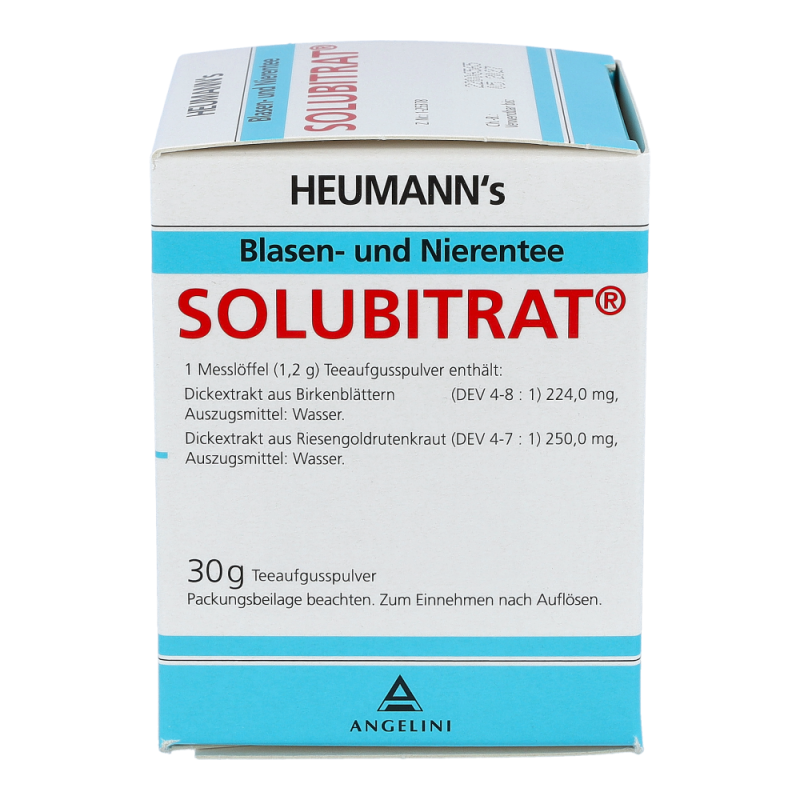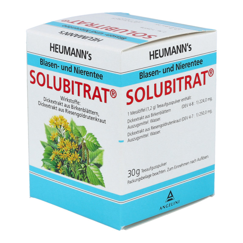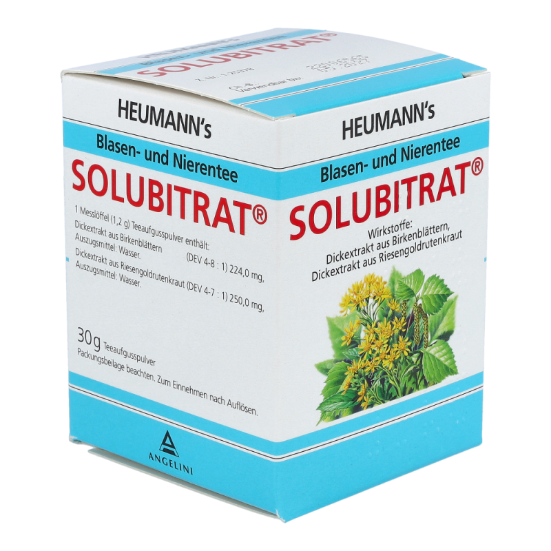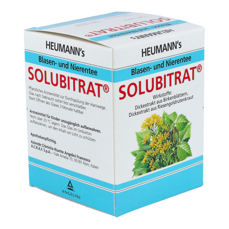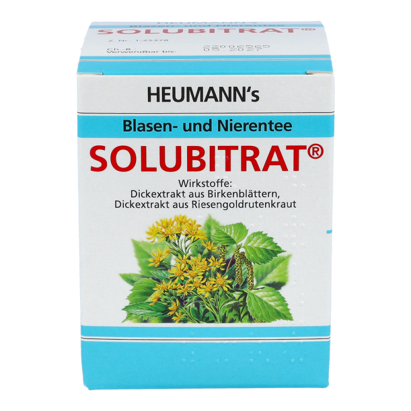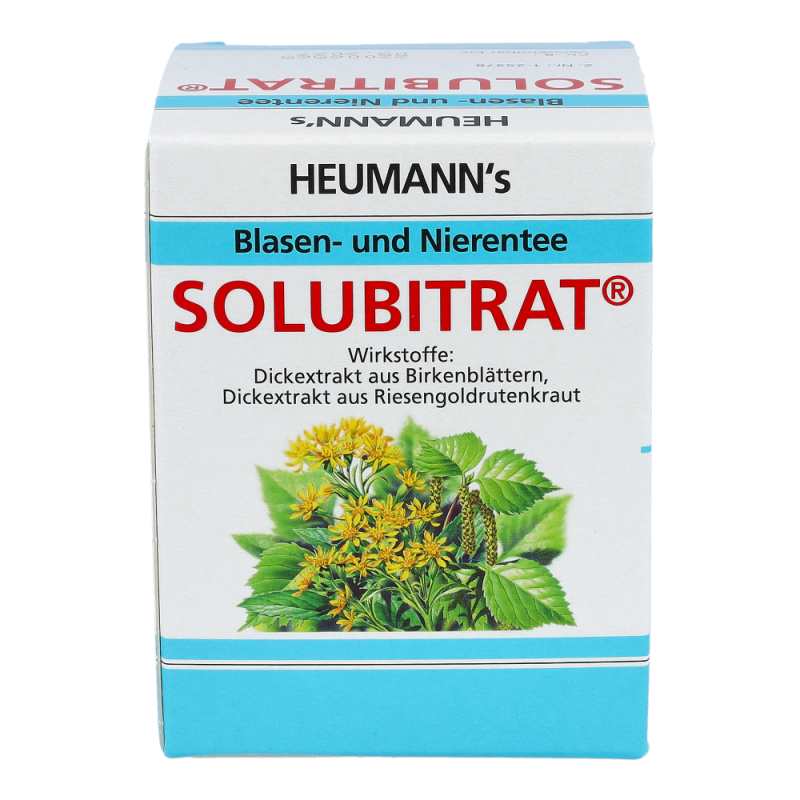 Heumann’s Blasen- und Nierentee Solubitrat ist ein pflanzliches Arzneimittel zur Durchspülung bei krampfartigen und entzündlichen Erkrankungen der Harnwege, bei Nierengrieß, zur Vor- und Nachsorgebehandlung bei Harnsteinen. Dieses Arzneimittel wird angewendet bei Erwachsen und Jugendlichen ab 12 Jahren.