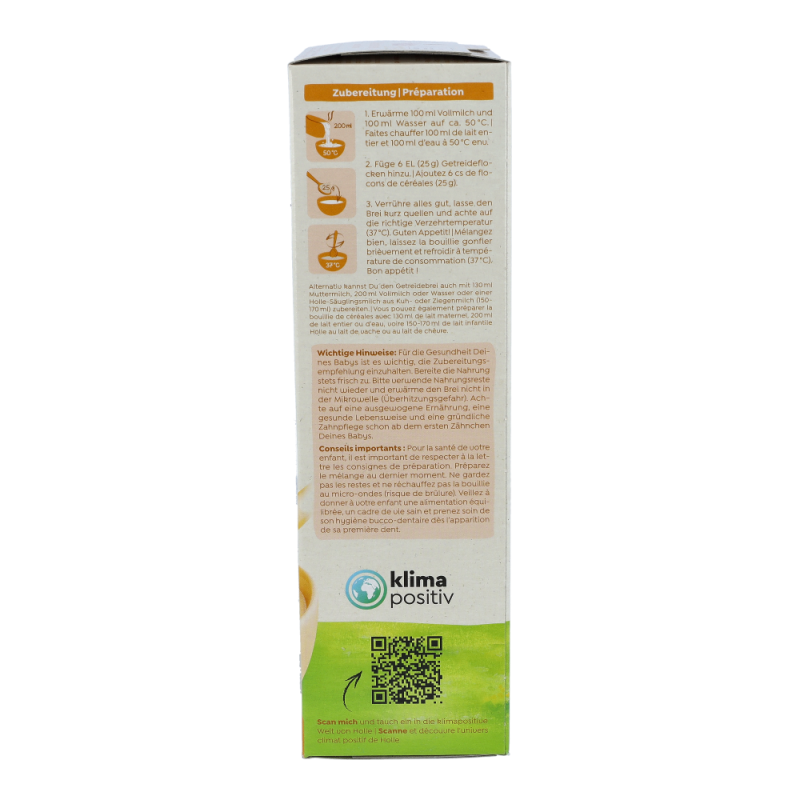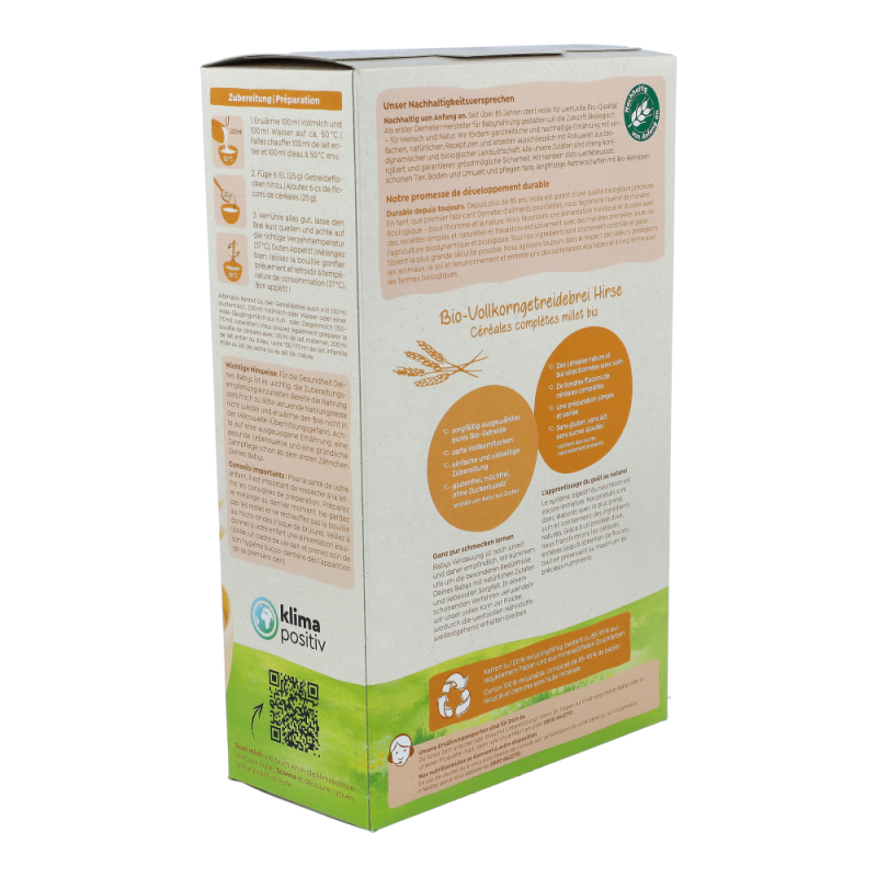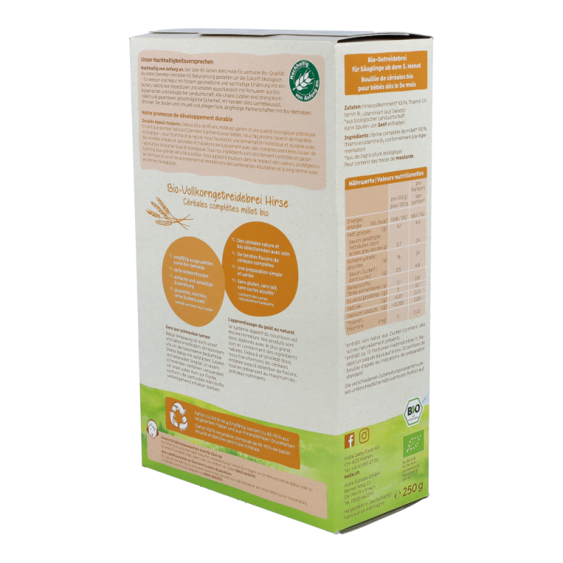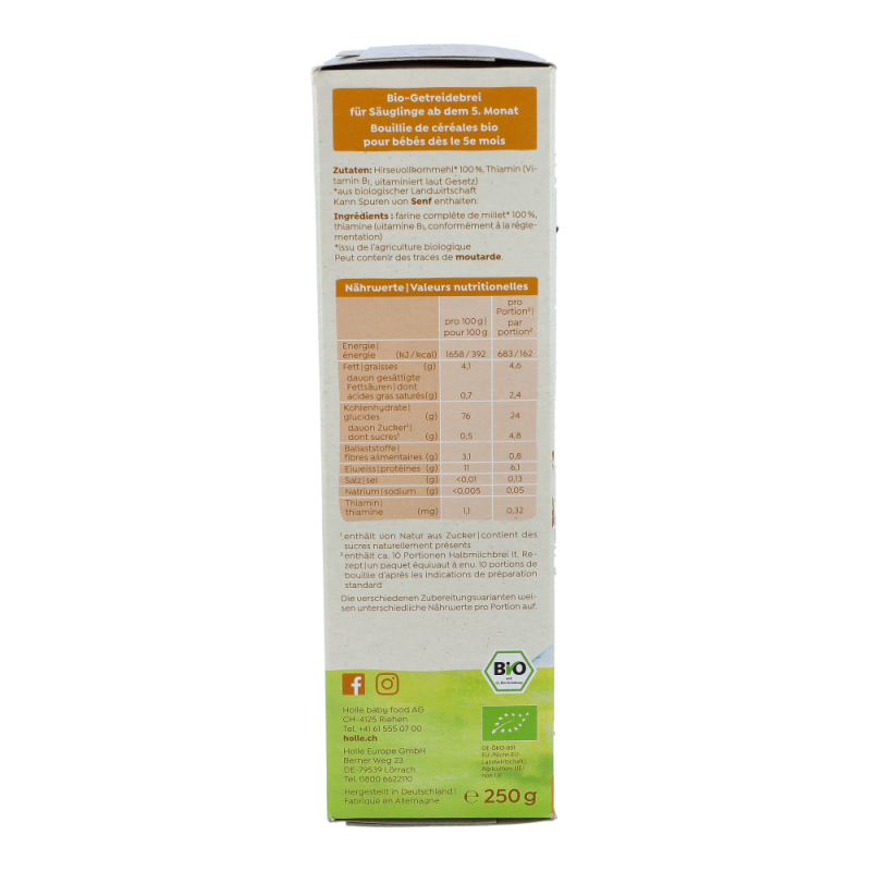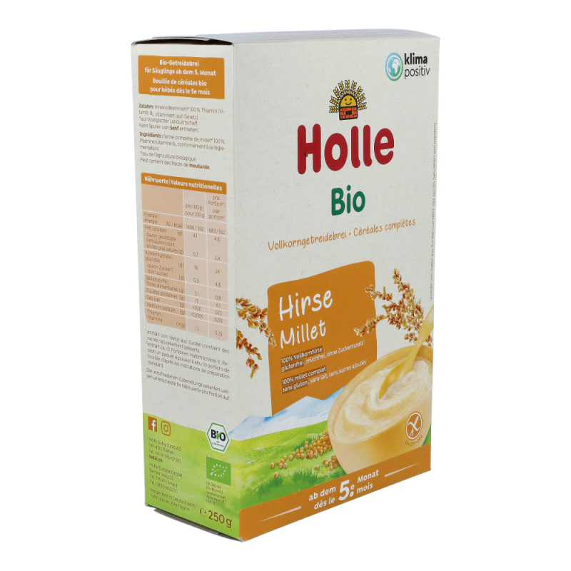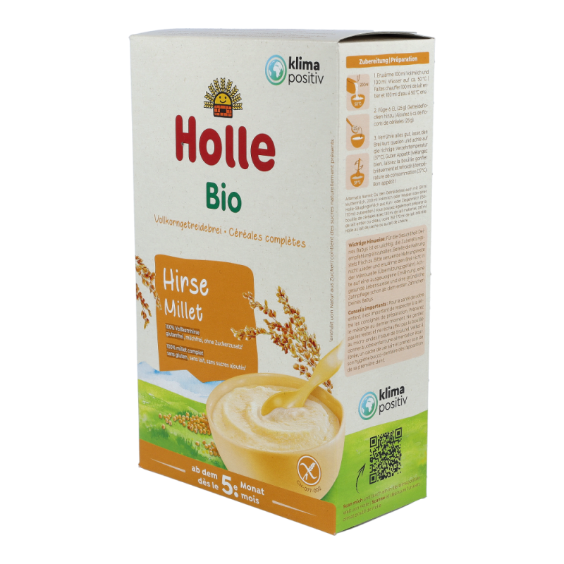 Holle BIO-Vollkorngetreidebrei Hirse eignet sich besonders gut für den Beginn mit Beikost, frühestens nach dem 4. Lebensmonat als Teil einer gemischten Ernährung.