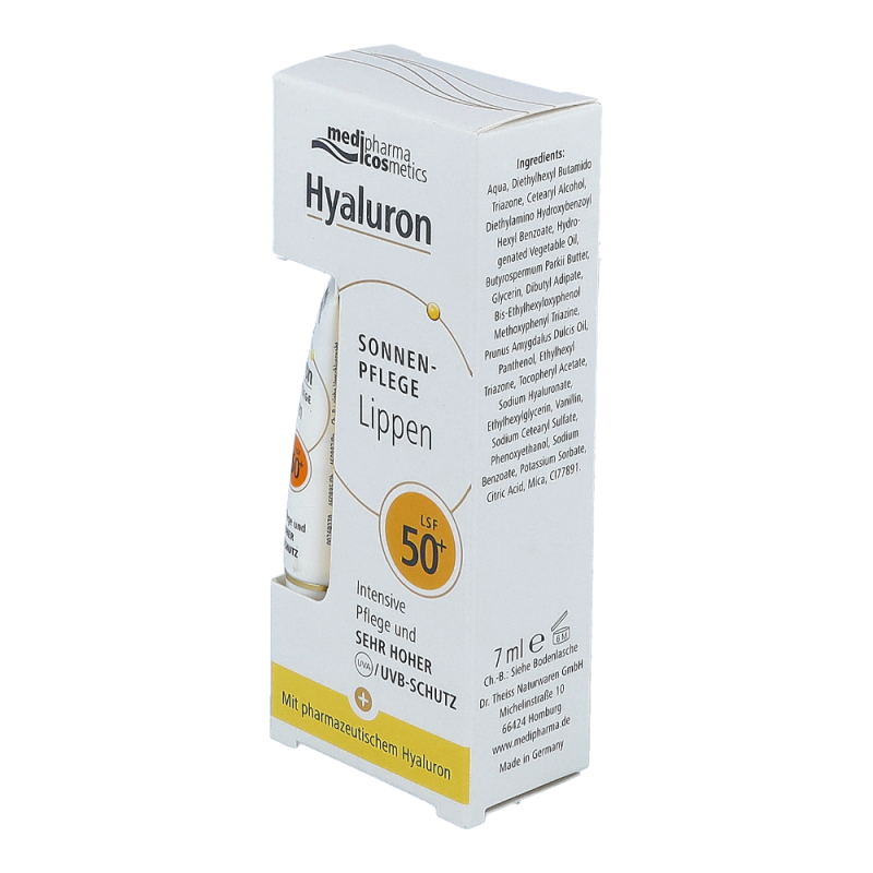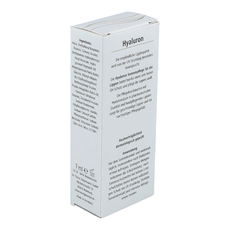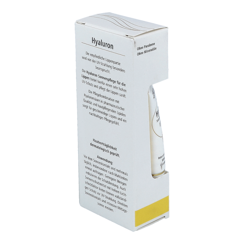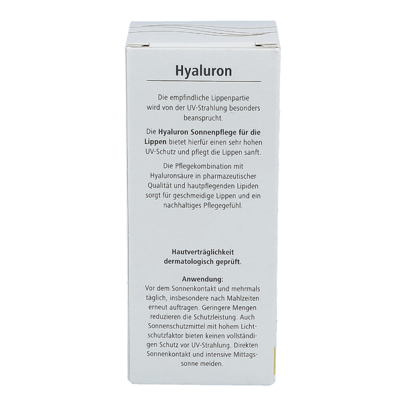 Hyaluron Sonnenpflege Lippen 7 ml LSF 50+ bietet einen sehr hohen Schutz für die zarte und sehr empfindliche Lippenpartie. Die Lippenpflege spendet intensive Feuchtigkeit und schützt Ihre Lippen vor der Sonne! Spüren Sie Ihre geschmeidigen Lippen und ein nachhaltiges Pflegegefühl.