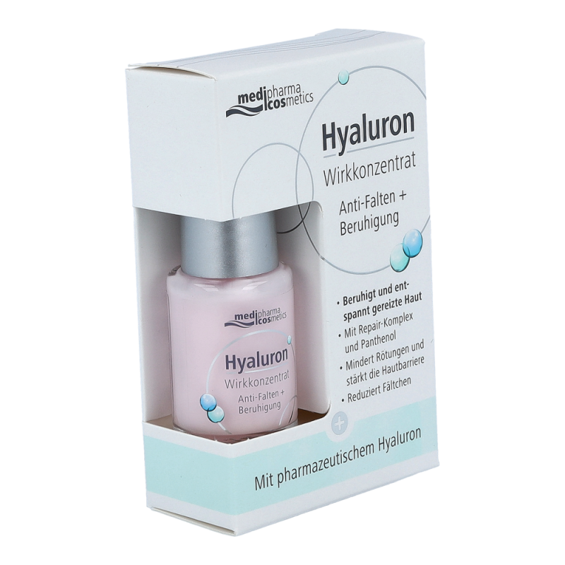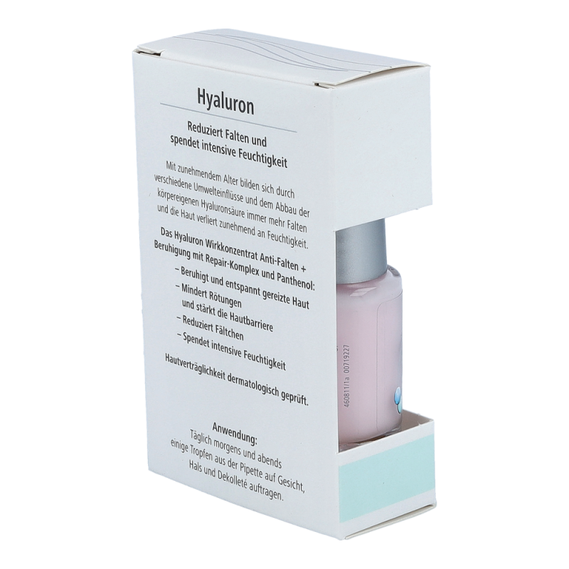 Hyaluron Wirkkonzentrat wirkt dem Feuchtigkeitsverlust der Haut und der Bildung von Falten entgegen, welche sich mit zunehmendem Alter durch verschiedene Umwelteinflüsse und dem Abbau der körpereigenen Hyaluronsäure bilden.