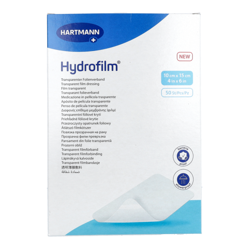 Hydrofilm® steril ist ein steriler, selbsthaftender Transparentverband; aus keim- und wasserdichter, semipermeabler Polyurethan-Folie; mit hypoallergenem Kleber.