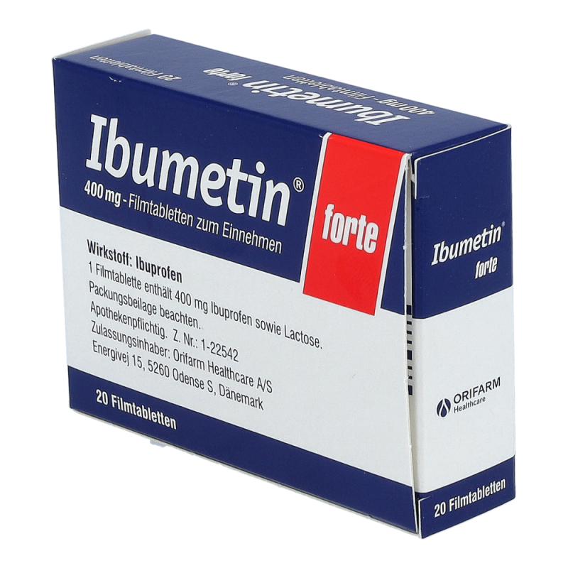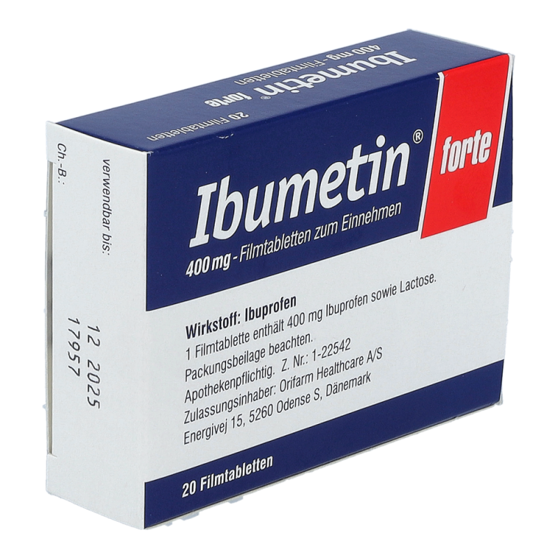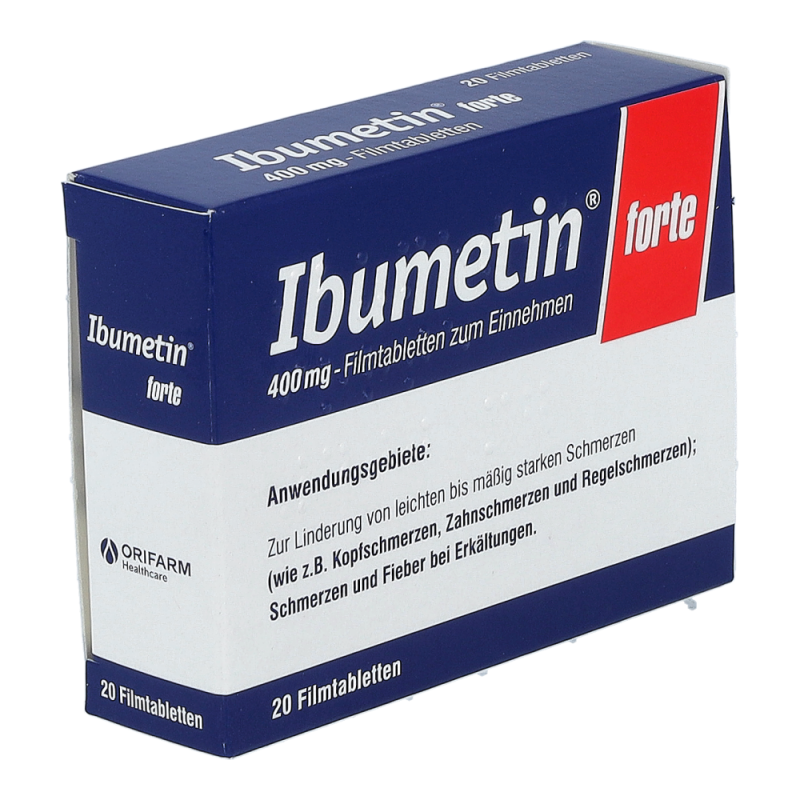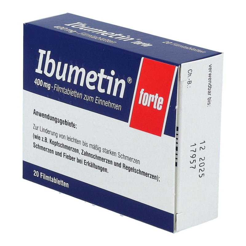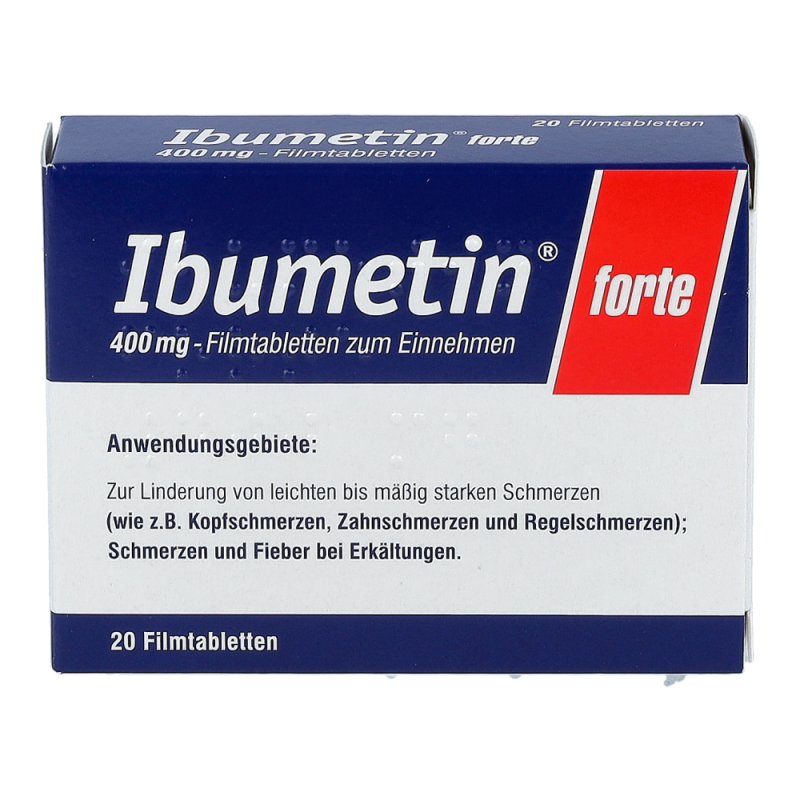 Eine Ibumetin forte 400 mg – Filmtablette enthält als Wirkstoff 400 mg Ibuprofen und wird angewendet zur Linderung von leichten bis mäßig starken Schmerzen (wie z.B. Kopfschmerzen, Zahnschmerzen und Regelschmerzen) sowie zur Linderung von Schmerzen und Fieber bei Erkältungen.