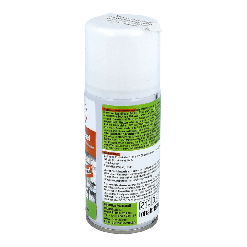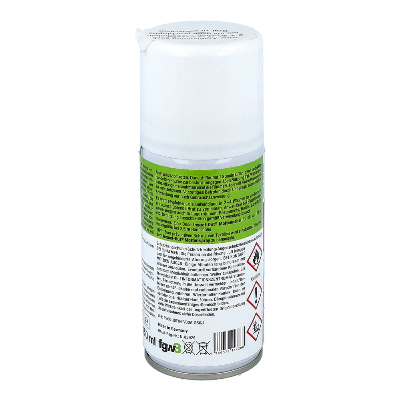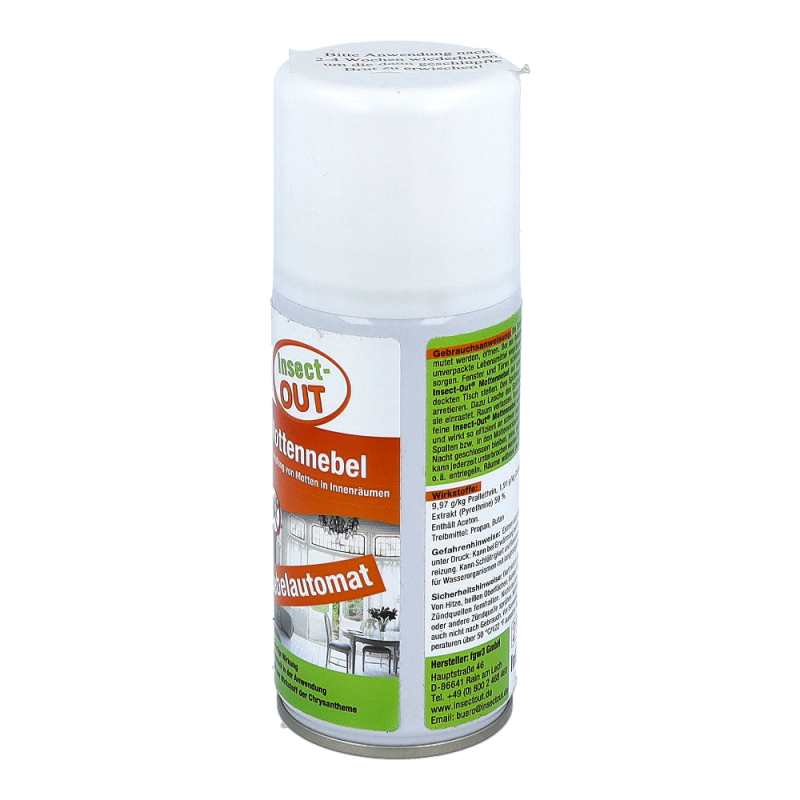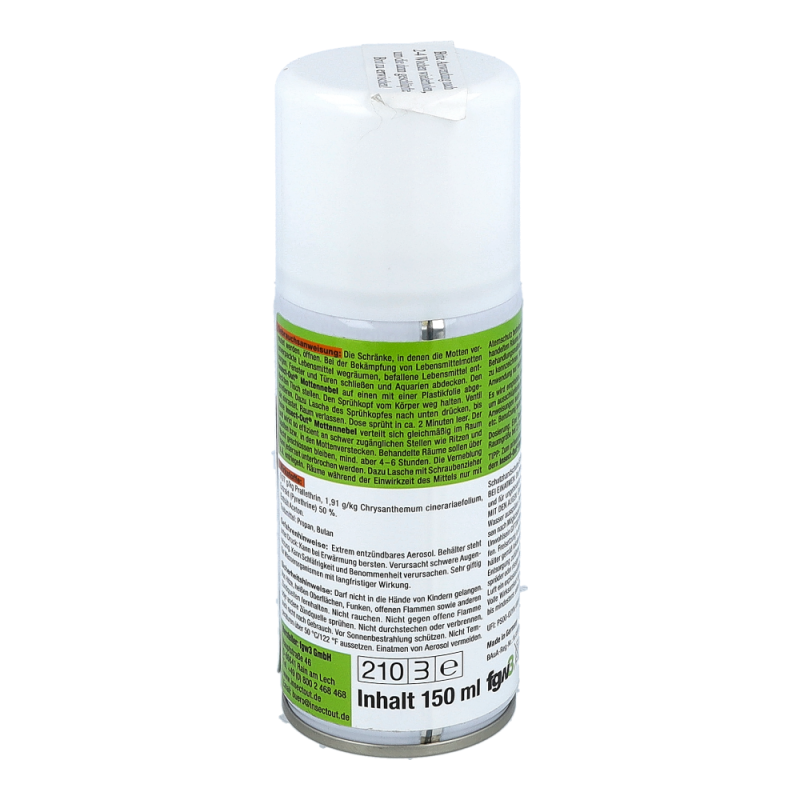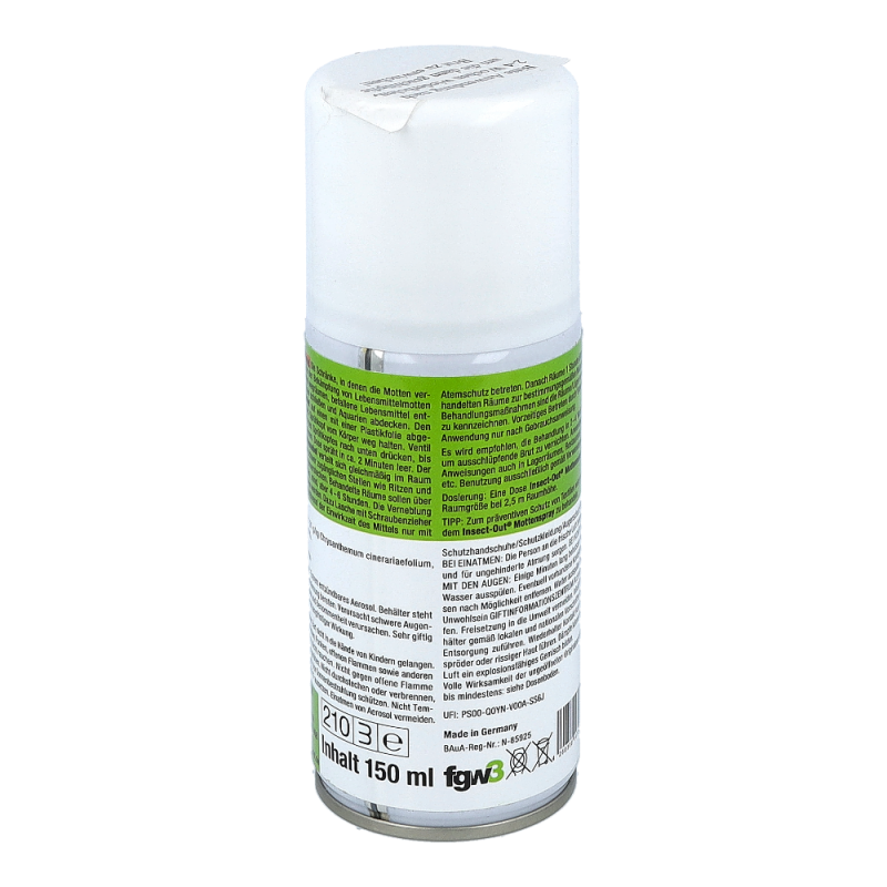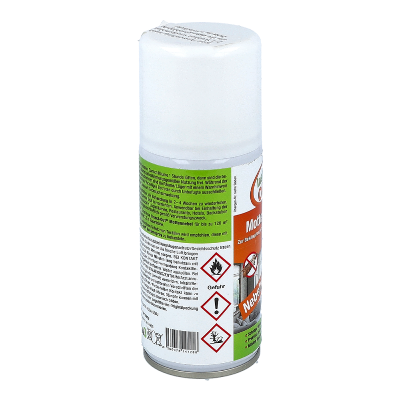 Beihartnäckigem und großflächigem Mottenbefall von Innenräumen ist eine Doseausreichend für bis zu 300m³. Nach Entriegelung einer Dose muss der Raumverlassen werden. Einwirkzeit am besten über Nacht, nach ausreichendem Lüftenkönnen die Räume wieder benutzt werden. Auch für Lebensmittelbetriebe geeignet.Wiederbehandlung nach 4 bis 6 Wochen wird empfohlen, um nachschlüpfende Brut zuvernichten.