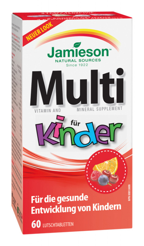 Multivitamin mit 17 Nährstoffen inklusive Eisen für die gesunde Entwicklung von Kindern. Multi für Kinder mit Eisen besteht aus einer Mischung aus Obst und Gemüse ohne Kunstfarbstoffe, Aromen und Aspartam. Lutschtabletten in der Form beliebter Tiere (Löwe, Elefant, Nilpferd und Affe) aus 4 Aromen (Orange, Traube, Himbeere und Morello-Kirsche). Kalzium und Vitamin D sind für das normale Wachstum und die Entwicklung von Kindern (Entwicklung von Knochen und Zähnen) nötig. Eisen trägt zu einer normalen kognitiven Funktion bei. Jod trägt zum normalen Wachstum von Kindern bei.