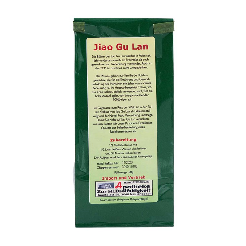Jiaogulan Tee ist ein gehaltvoller, kräftiger Tee mit einem herb-süßen Geschmack, der wie Ginseng die Körperenergien ins Gleichgewicht bringt und das allgemeine Wohlbefinden verbessert. Da er sehr ergiebig ist, genügt auf einen halben Liter Wasser ein Teebeutel, bzw. ein Teelöffel loser Jiaogulan-Tee.