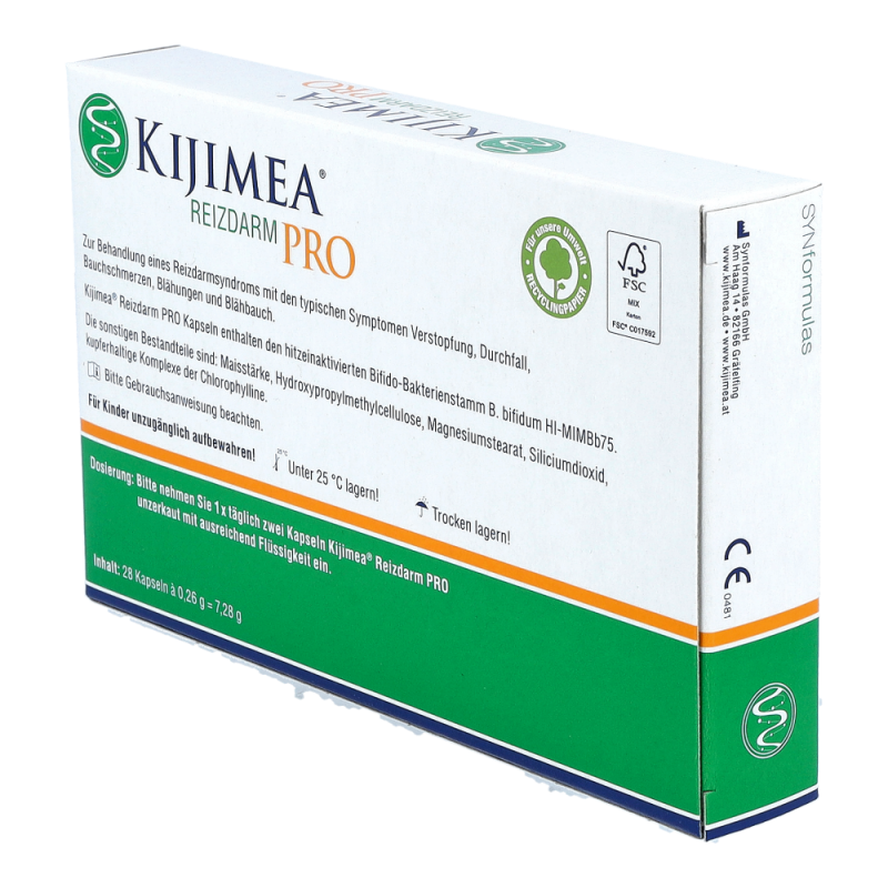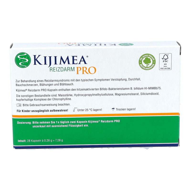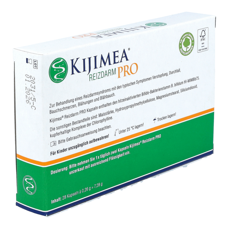 1 x täglich zwei Kapseln Kijimea® Reizdarm PRO zu einer Mahlzeit unzerkaut mit ausreichend Flüssigkeit (z. B. einem Glas Wasser) einnehmen. Um optimale Ergebnisse zu erzielen, sollten Kijimea® Reizdarm PRO Kapseln für mindestens vier Wochen, besser zwölf Wochen eingenommen werden. Es liegen keine Erkenntnisse vor, die gegen eine Einnahme von Kijimea® Reizdarm PRO Kapseln für Kinder und Jugendliche sprechen.