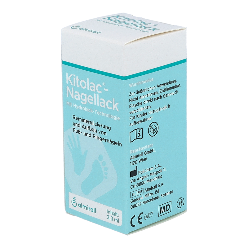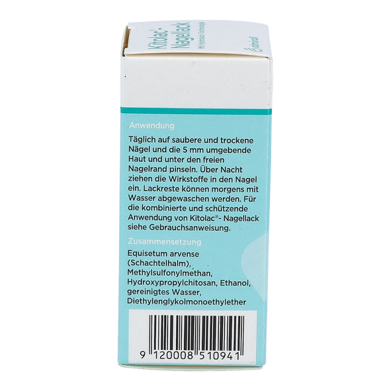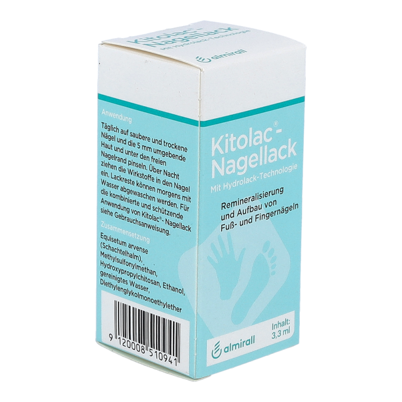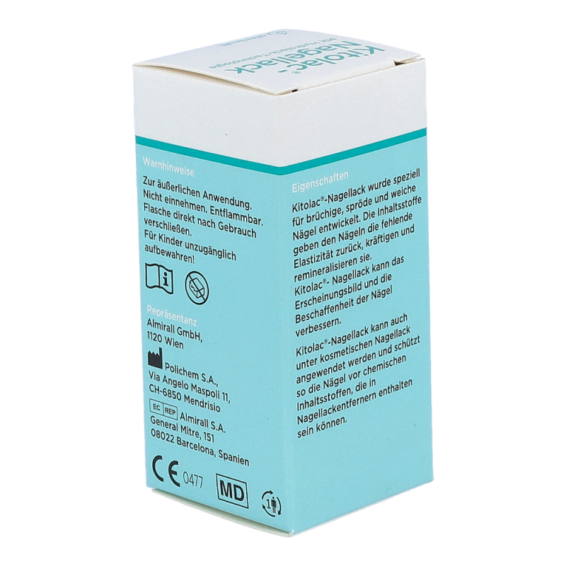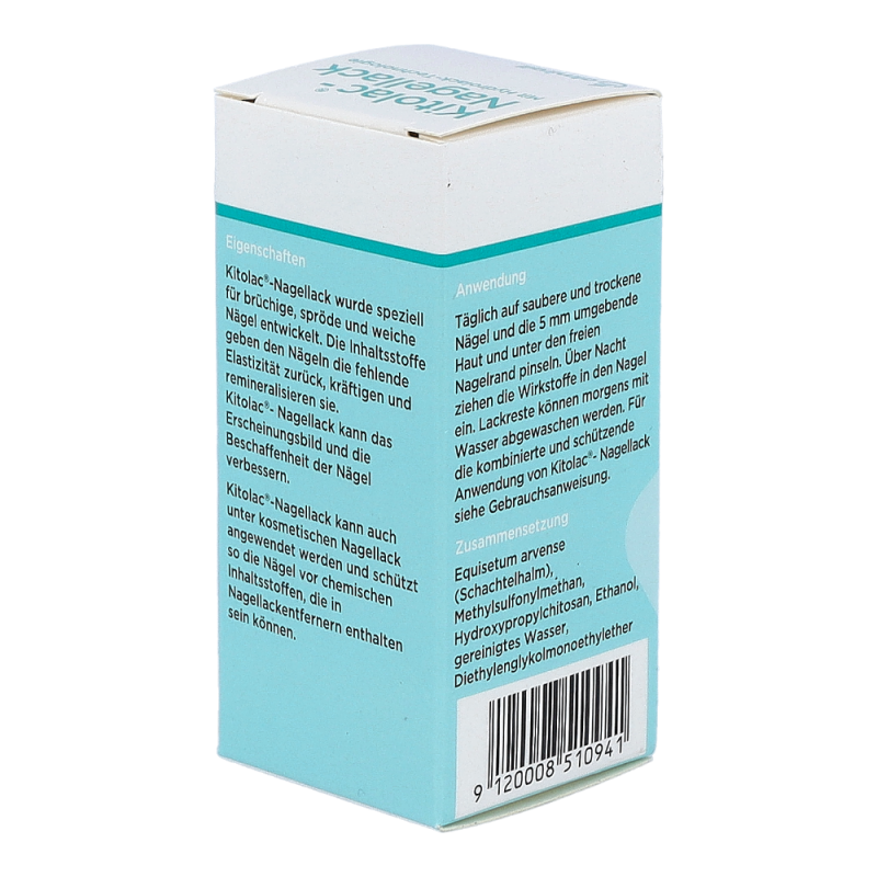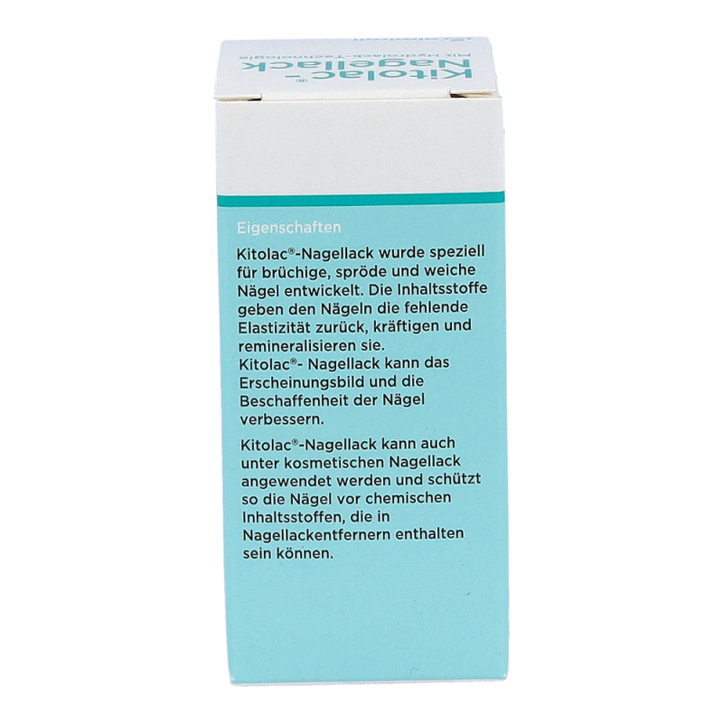 Kitolac Nagellack mit seiner besonderen Formel gibt den Nägeln die fehlende Elastizität zurück, kräftigt und remineralisiert sie. Bereits innerhalb von 4 Wochen kann Kitolac® Nagellack das Erscheinungsbild der Nägel entscheidend verbessern. Wenn Sie ein sehr gutes Ergebnis bei brüchigen und splitternden Nägeln erzielen möchten, empfiehlt sich die Anwendung als Kur für ca. 3 Monate.