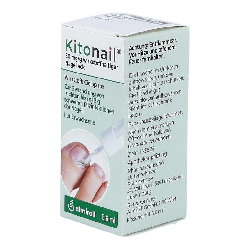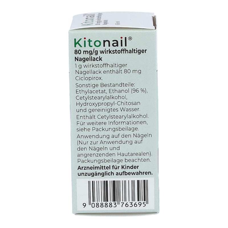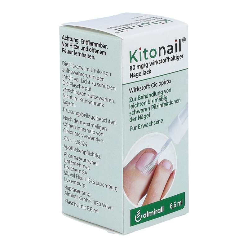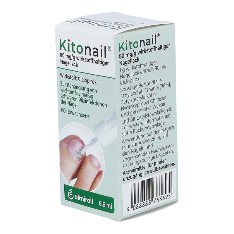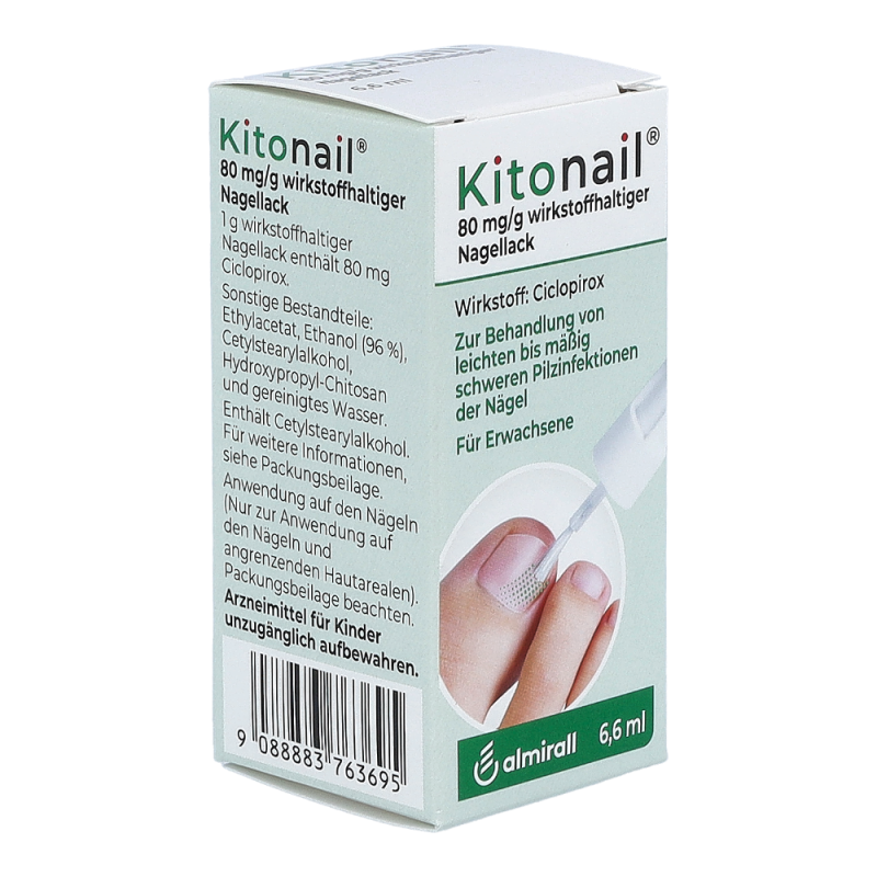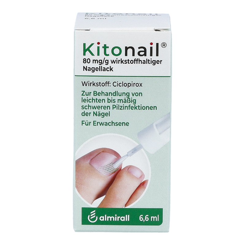 Kitonail Nagellack ist ein wirksames Mittel gegen verschiedene Pilzerkrankungen zur äußerlichen Anwendung auf Fingernägeln, Zehennägeln und der unmittelbar angrenzenden Haut. Es wird zur Behandlung von leichten bis mäßig schweren Pilzinfektionen der Nägel angewendet. Der Wirkstoff Ciclopirox verhindert ein Wachstum der Pilze und zerstört diese. Dadurch wird das Erscheinungsbild Ihres Nagels verbessert.