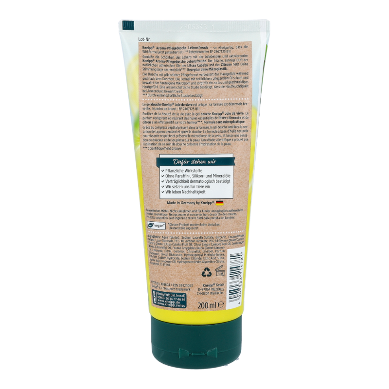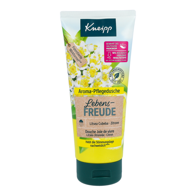 Genießen Sie die Schönheit des Lebens mit der belebenden und aktivierenden Kneipp® Aroma-Pflegedusche Lebensfreude. Der frische, sonnige Duft der natürlichen ätherischen Öle der Litsea Cubeba und der Zitrone hebt Ihre Stimmungslage nachweislich*. Natürliches pflegendes Öl verwöhnt die Haut und macht sie zart und geschmeidig.
