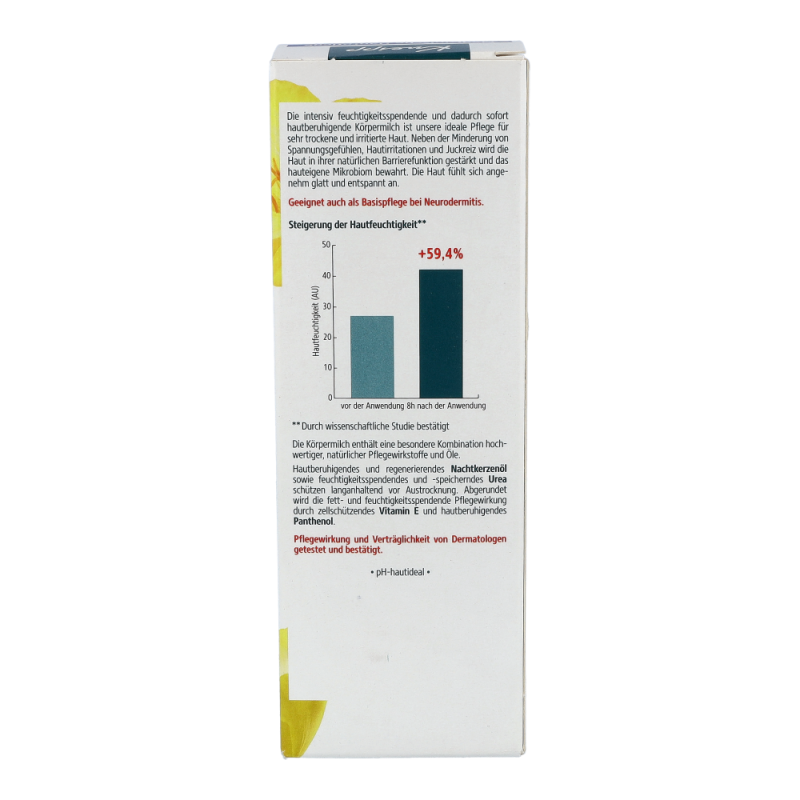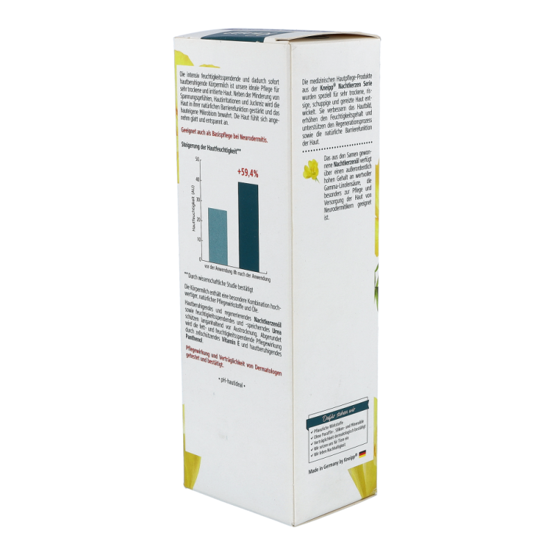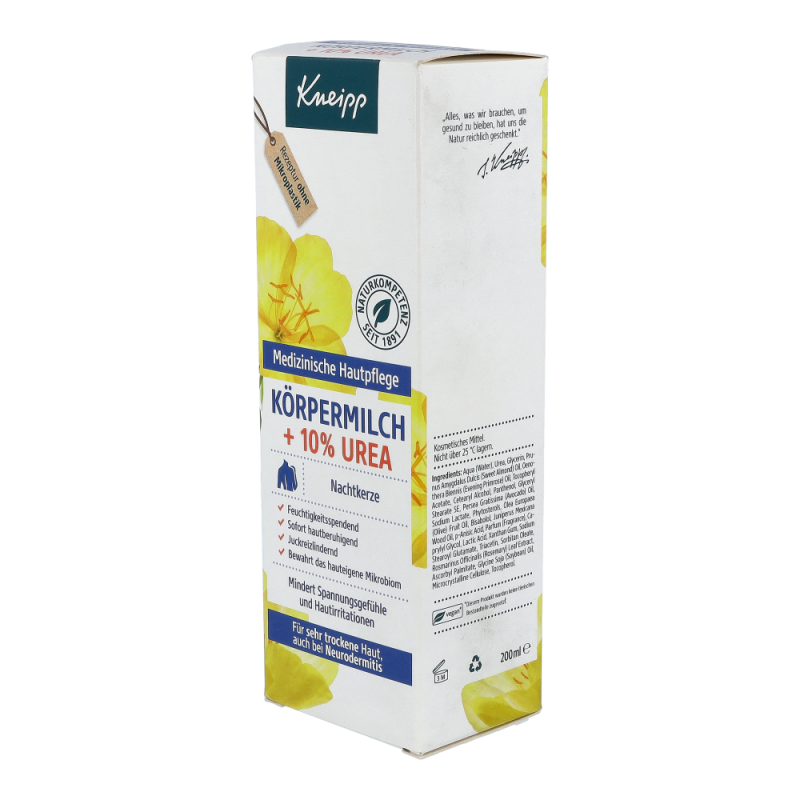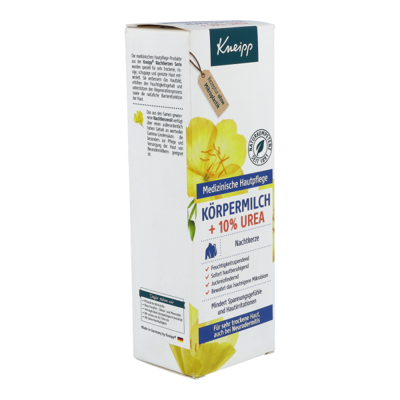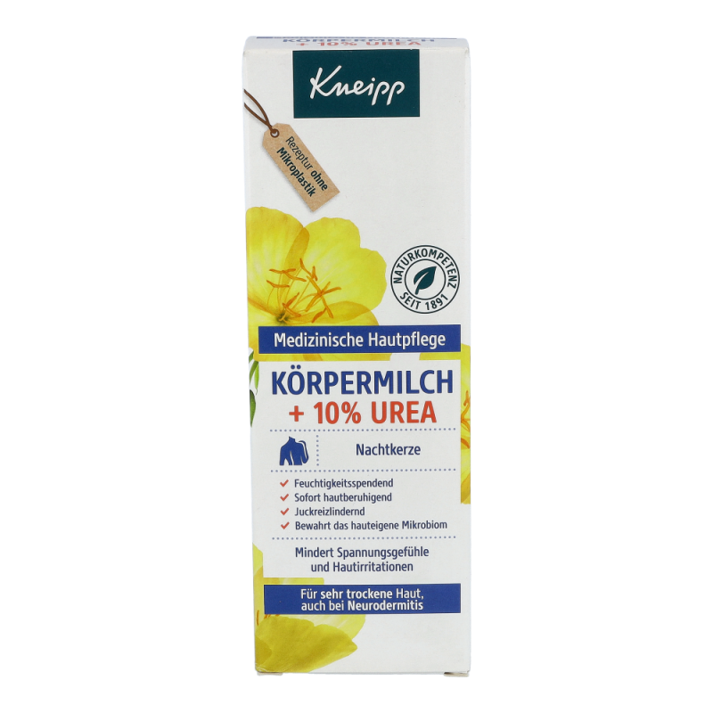 Kneipp Körpermilch Nachtkerze + 10% Urea ist die ideale medizinische Hautpflege für sehr trockene Haut bis hin zu Neurodermitis. Die Körpermilch wirkt besonders feuchtigkeitsspendend und hautberuhigend. Spannungsgefühle, Hautirritationen und Juckreiz werden gemildert. Die natürliche Barrierefunktion Ihrer Haut wird gestärkt, Ihre Haut fühlt sich glatt und entspannt an. Urea wirkt feuchtigkeitsbindend und -speichernd und schützt so Ihre Haut langanhaltend vor Austrocknung – jetzt besonders günstig bestellen und Ihre Haut verwöhnen!