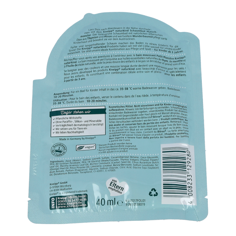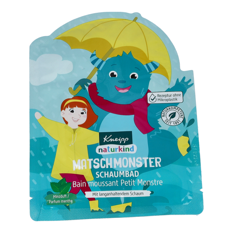 Ab in die Wanne mit dem Kneipp Naturkind Matschmonster Schaumbad! Das türkisgrüne Schaumbad mit natürlichen ätherischen Ölen aus Thymian und Minze und dem wertvollen Wunderbaumöl durchwärmt kleine Abenteurer & pflegt die zarte Kinderhaut. Denn draußen kann man immer etwas erleben – egal bei welchem Wetter.Mit Farbe und langanhaltendem Schaum zum Entdecken und Experimentieren – so wird Baden spielerisch zu einem Erlebnis für die kindlichen Sinne! Die Kneipp Naturkind Produkte haben wir mit ganz viel Liebe speziell für unsere Kinder entwickelt. Sie sind die ideale Kombination aus Pflege und Spaß – für Kinder ab 3 Jahren.