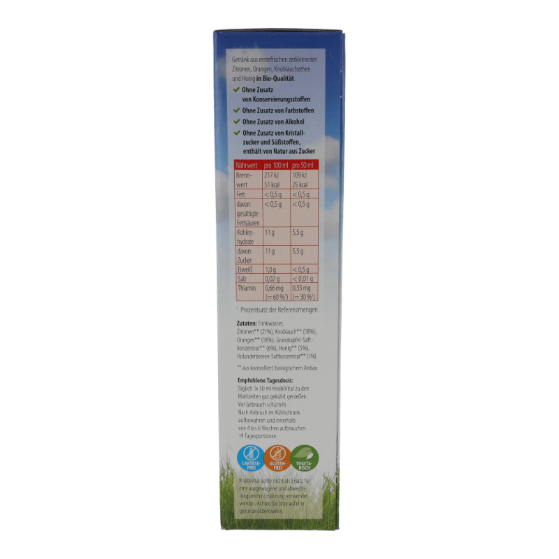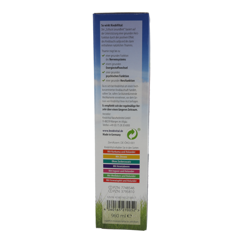 Knobivital enthält von Natur aus lebensnotwendiges Thiamin. Thiamin trägt bei zu: einer normalen Herzfunktion, einer normalen Funktion des Nervensystems, einem normalen Energiestoffwechsel und einer normalen psychischen Funktion.