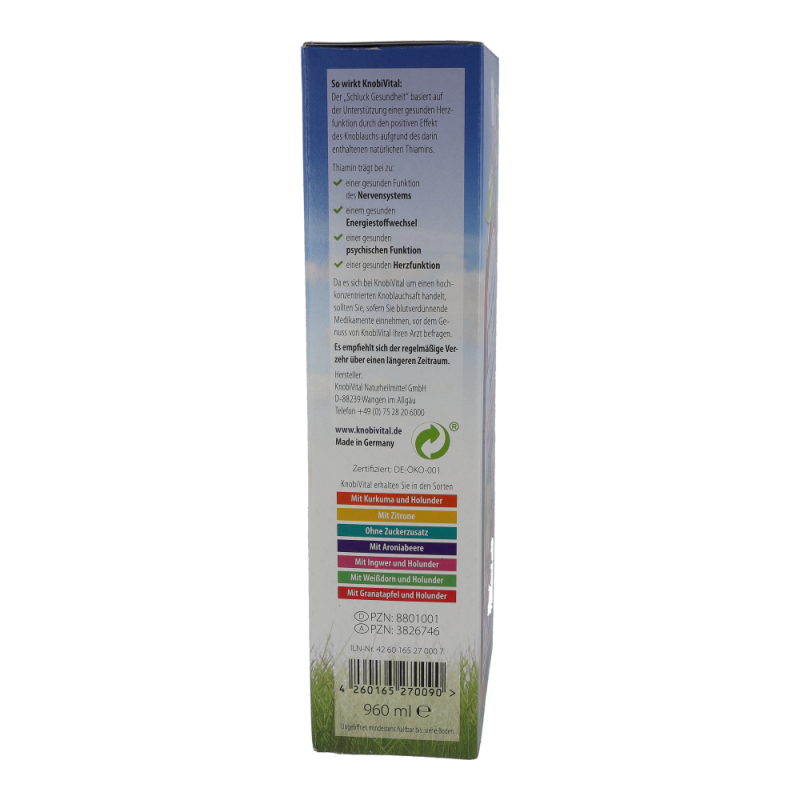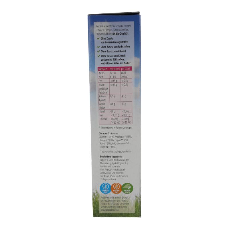 Knobivital enthält von Natur aus lebensnotwendiges Thiamin. Thiamin trägt bei zu: einer normalen Herzfunktion, einer normalen Funktion des Nervensystems, einem normalen Energiestoffwechsel und einer normalen psychischen Funktion.