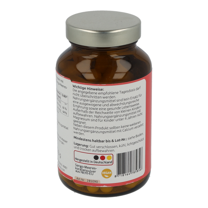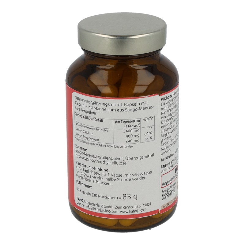 Drei Kapseln enthalten (empfohlene tägliche Verzehrmenge): 2400 mg Korallenkalzium Pulver, 300 mg Hydroxypropylmethylcellulose (Kapselhülle).