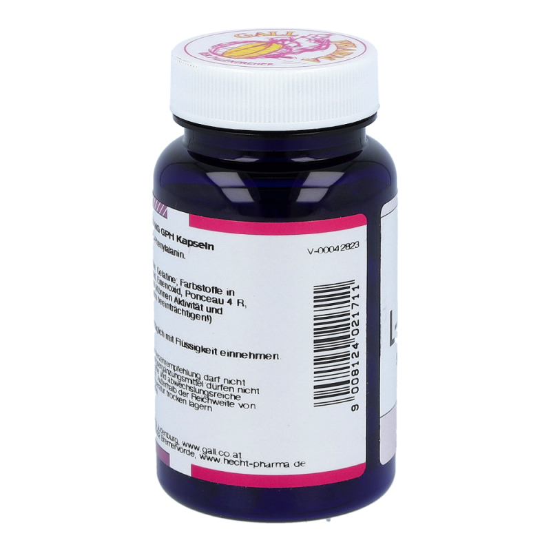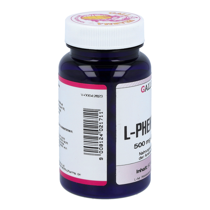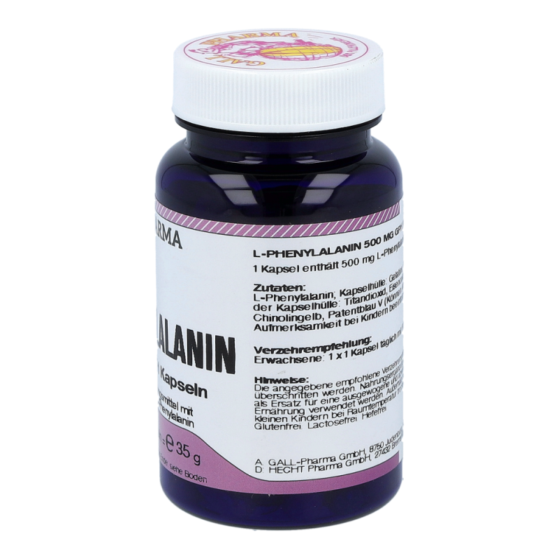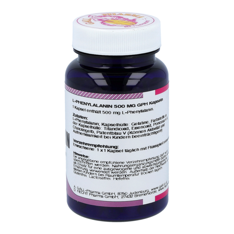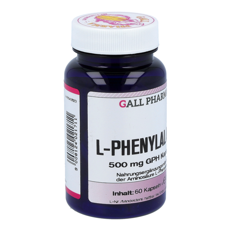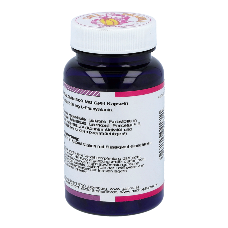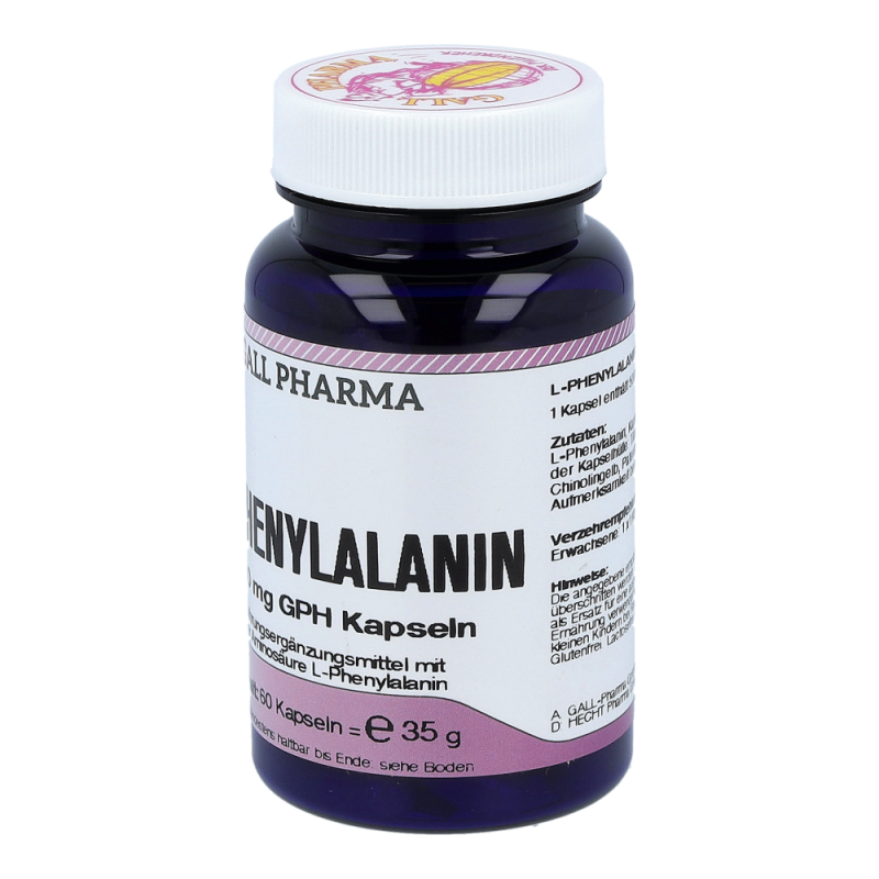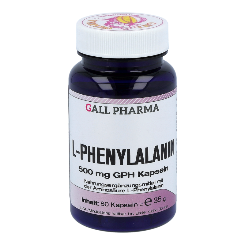 L-Phenylalanin 500 mg GPH Kapseln enthalten 500 mg L-Phenylalanin in einer Hartgelatinekapsel. Diese Aminosäure spielt als Vorstufe vieler wichtiger Botenstoffe eine große und vielseitige Rolle im Gehirn. Weiters ist sie Ausgangsmaterial für L-Tyrosin und für die Bildung weiterer wichtiger Stoffe im Körper verantwortlich. Diese Aminosäure ist für den Organismus unentbehrlich. Ihr werden Eigenschaften wie Besserung der Lernfähigkeit, Erinnerungsvermögen, Aufmerksamkeit und Beseitigung von Mattheit und Abgeschlagenheit zugeschrieben. Sie verlängert und erhöht die Aktivität der Glückshormone (Endorphine), was wesentlich zur Stimmung des Menschen beiträg.