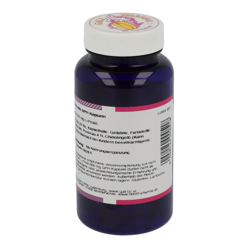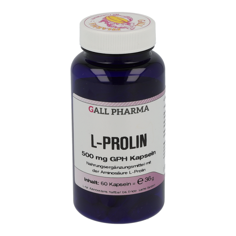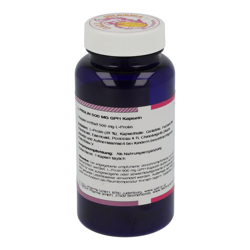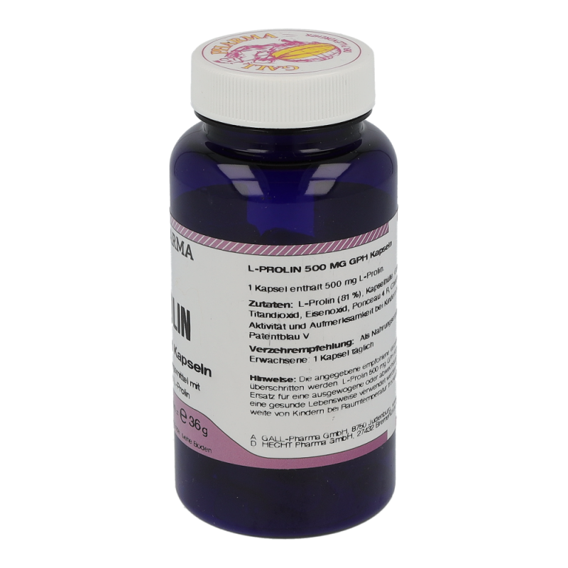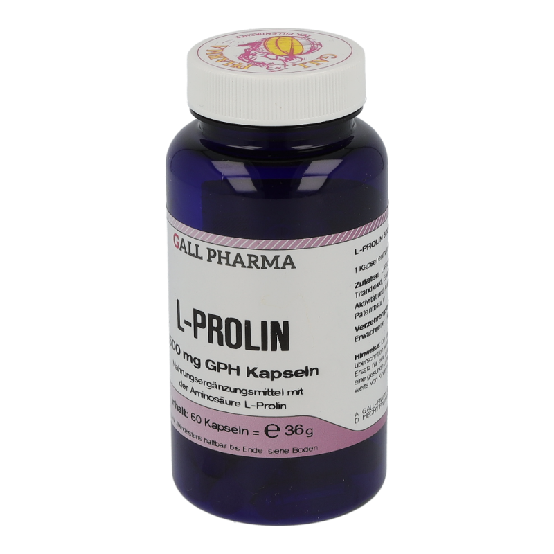 Gall Pharma L-Prolin 500 mg Kapseln enthalten 500 mg L-Prolin in einer Hartgelatinekapsel. Bedeutung hat diese Aminosäure vor allem für den Stoffwechsel des Kollagens