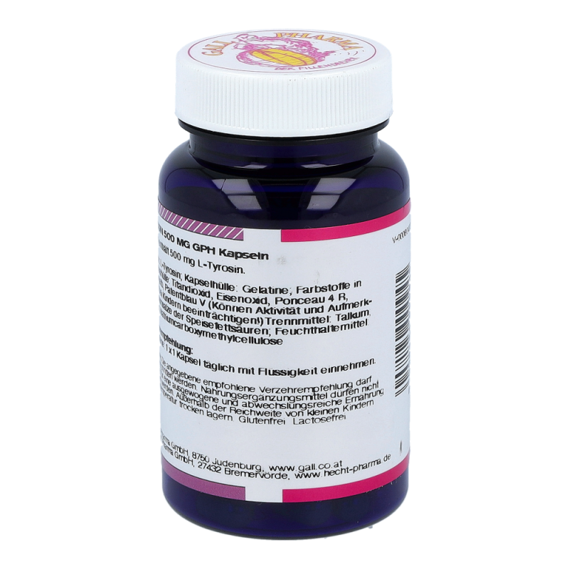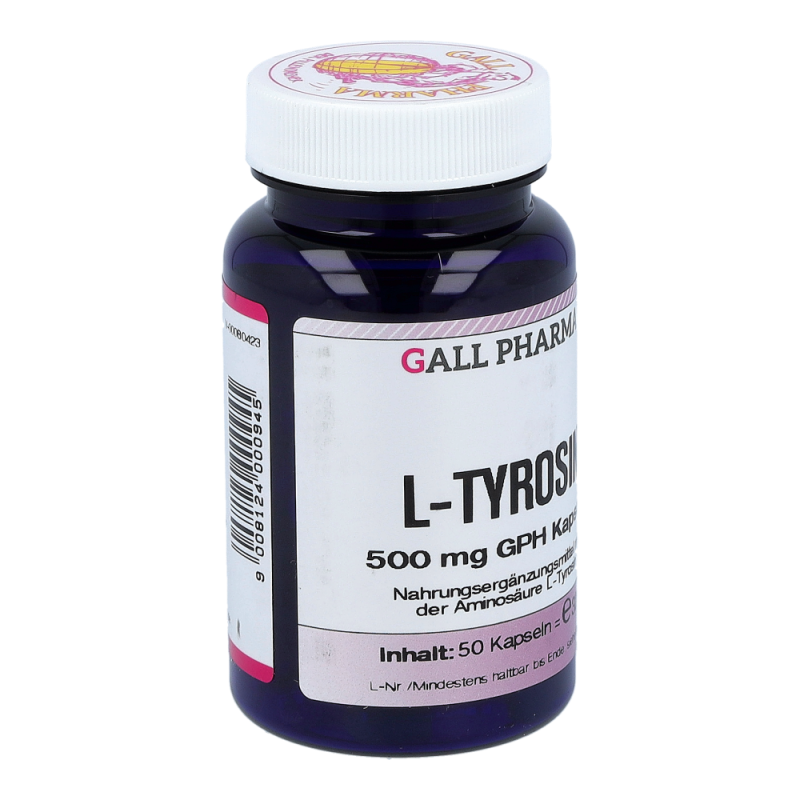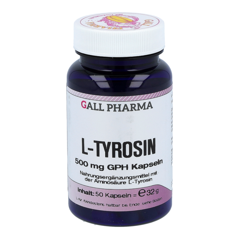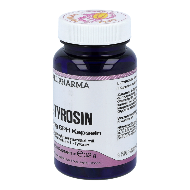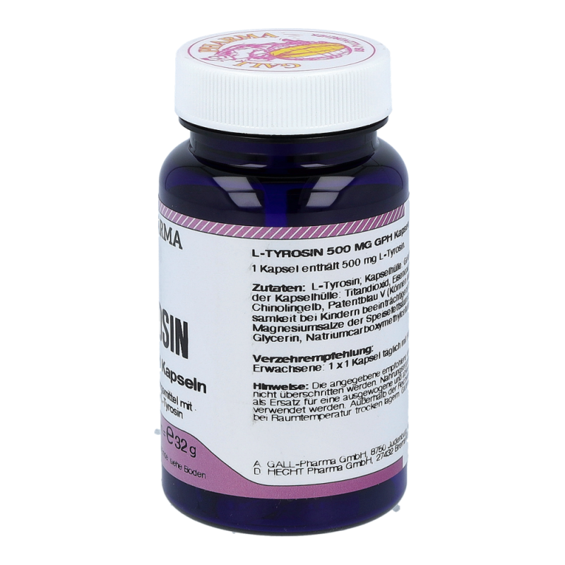 Gall Pharma L-Tyrosin 500 mg Kapseln enthalten 500 mg L-Tyrosin in einer Hartgelatinekapsel. L-Tyrosin ist Ausgangsmaterial bzw. Vorstufe wichtiger Stoffe im Körper. So unterstützt L-Tyrosin die natürliche Adrenalinproduktion.