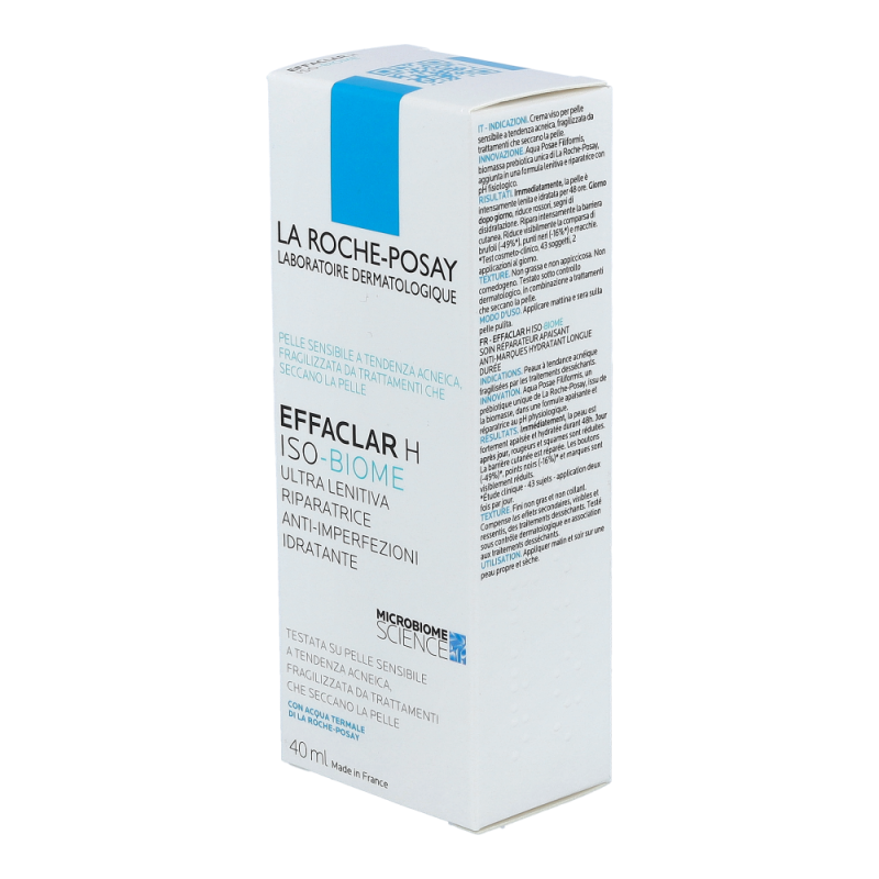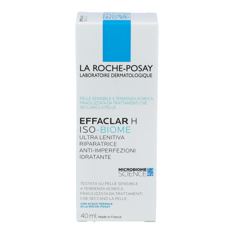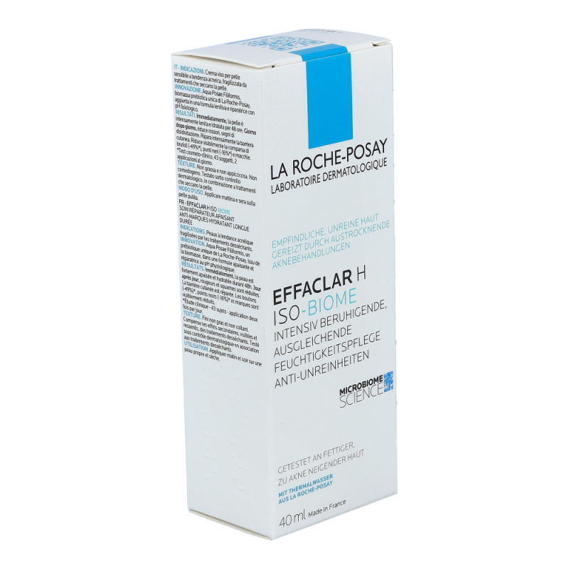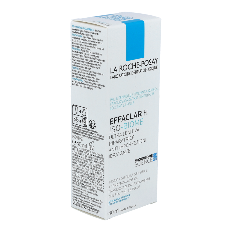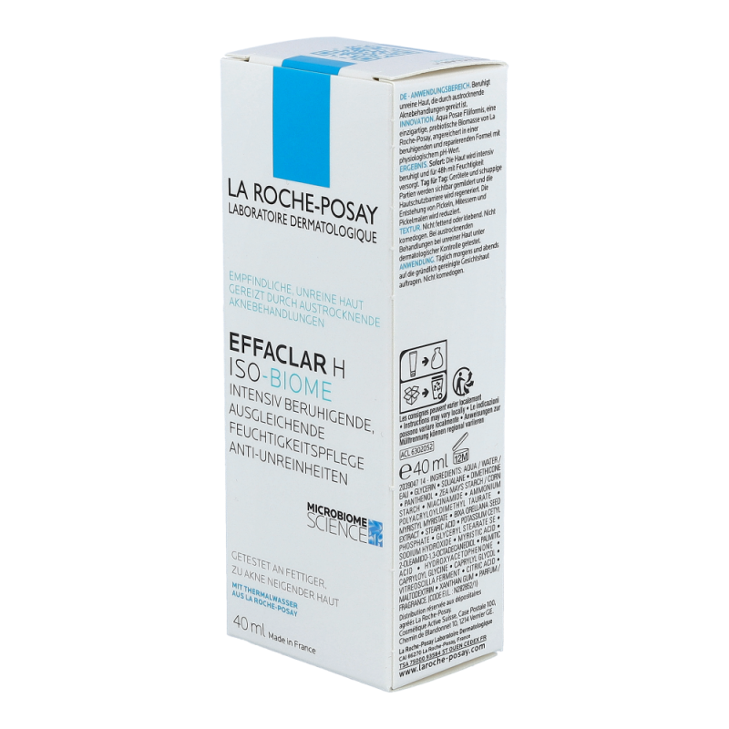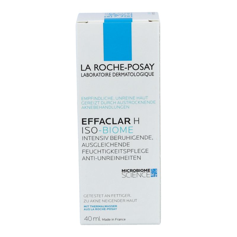 La Roche-Posay Effaclar H Iso-Biome Feuchtigkeitspflege 40 ml für trockene und zu Akne neigende Haut spendet 48h intensiv Feuchtigkeit. Als begleitende Pflege mildert sie Anzeichen von fettiger und durch austrocknende Akne-Behandlungen geschwächter Haut. Zudem gleicht die Feuchtigkeitscreme Hautbeschwerden aus, mildert Unreinheiten und beugt Pickelmalen vor.