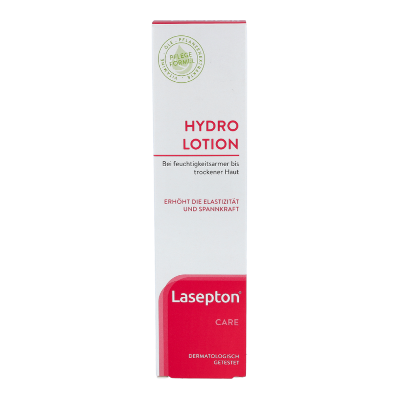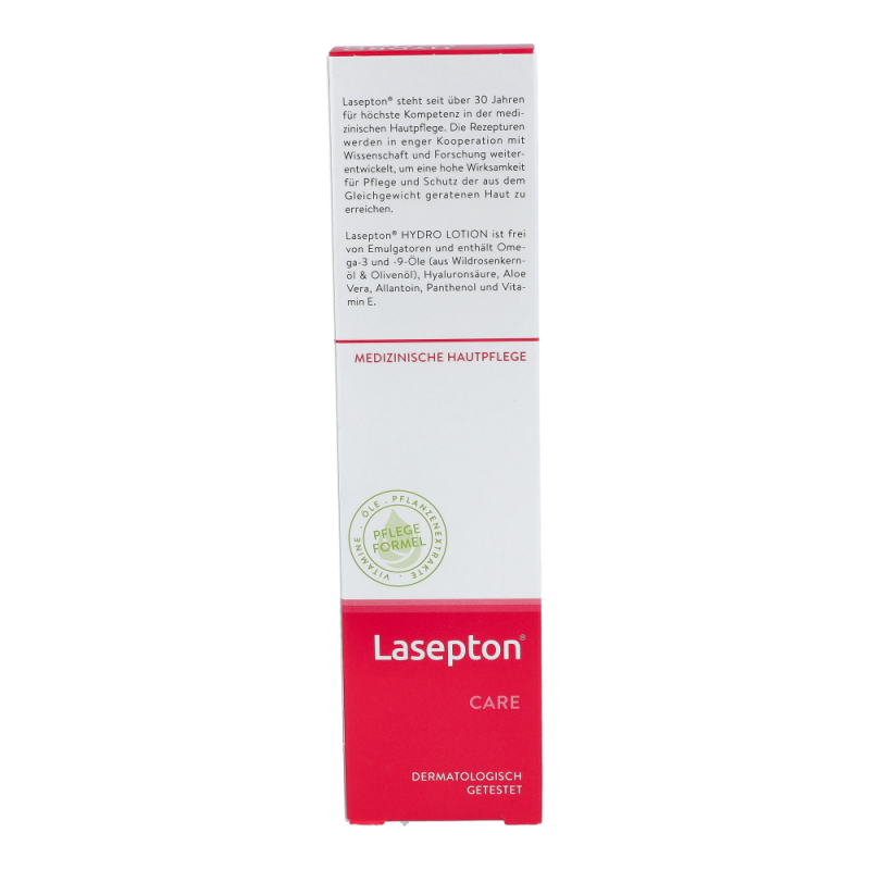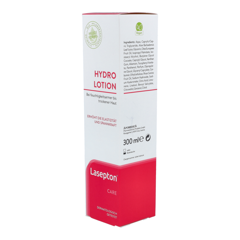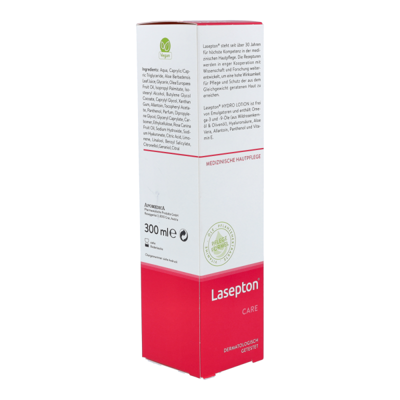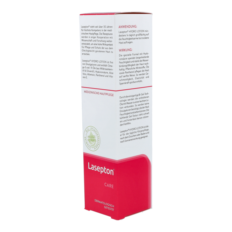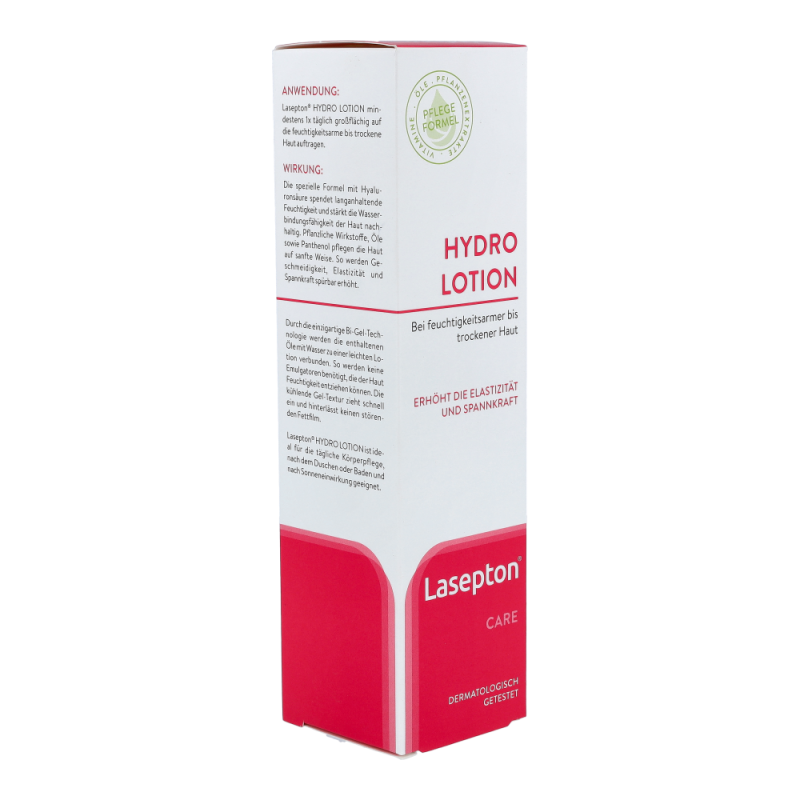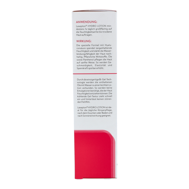 Lasepton Hydro Lotion 300 ml versorgt die feuchtigkeitsarme Haut durch die einzigartige Bi-Gel-Technologie mit hydratisierenden Stoffen. Hyaluronsäure stärkt die Wasserbindungsfähigkeit der Haut nachhaltig. Pflanzliche Wirkstoffe und Öle sowie Panthenol pflegen die Haut intensiv. Geschmeidigkeit, Elastizität und Spannkraft werden spürbar erhöht.