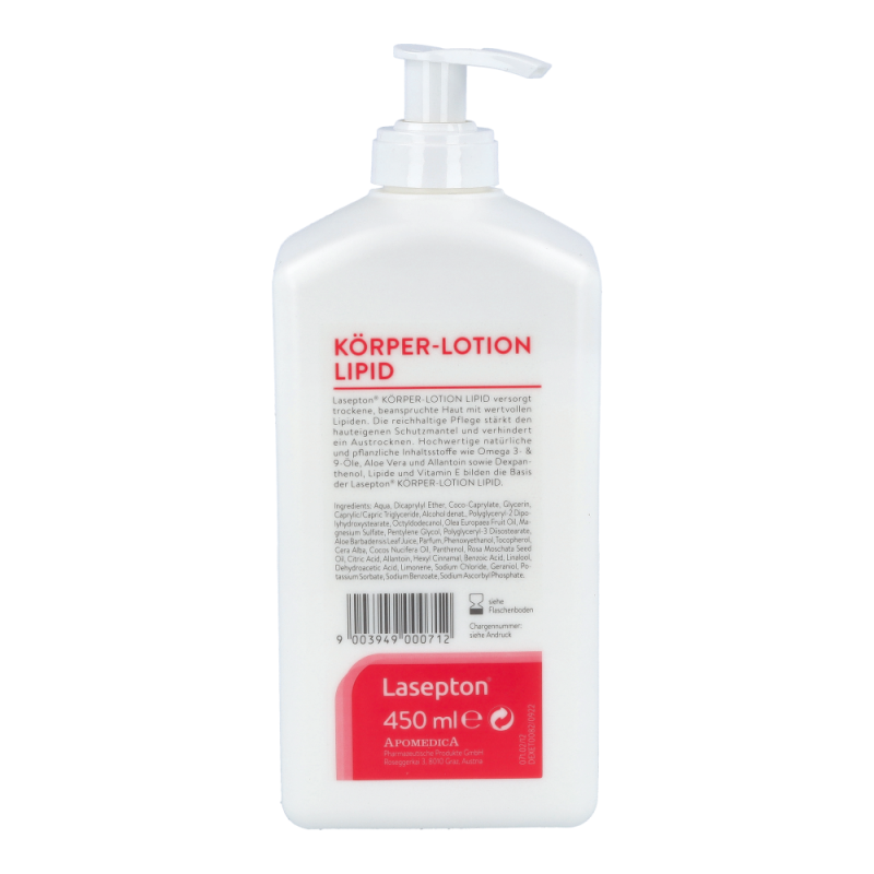 Lasepton® Körper-Lotion Lipid versorgt die trockene, beanspruchte Haut mit wertvollen Lipiden. Die reichhaltige Pflege stärkt den hauteigenen Schutzmantel und verhindert ein Austrocknen.Hochwertige natürliche und pflanzliche Stoffe wie Omega 3- & 9-Öle, Aloe Vera und Allantoin sowie Dexpanthenol, Lipide und Vitamin E bilden die Basis der Lasepton® Körper-Lotion Lipid..