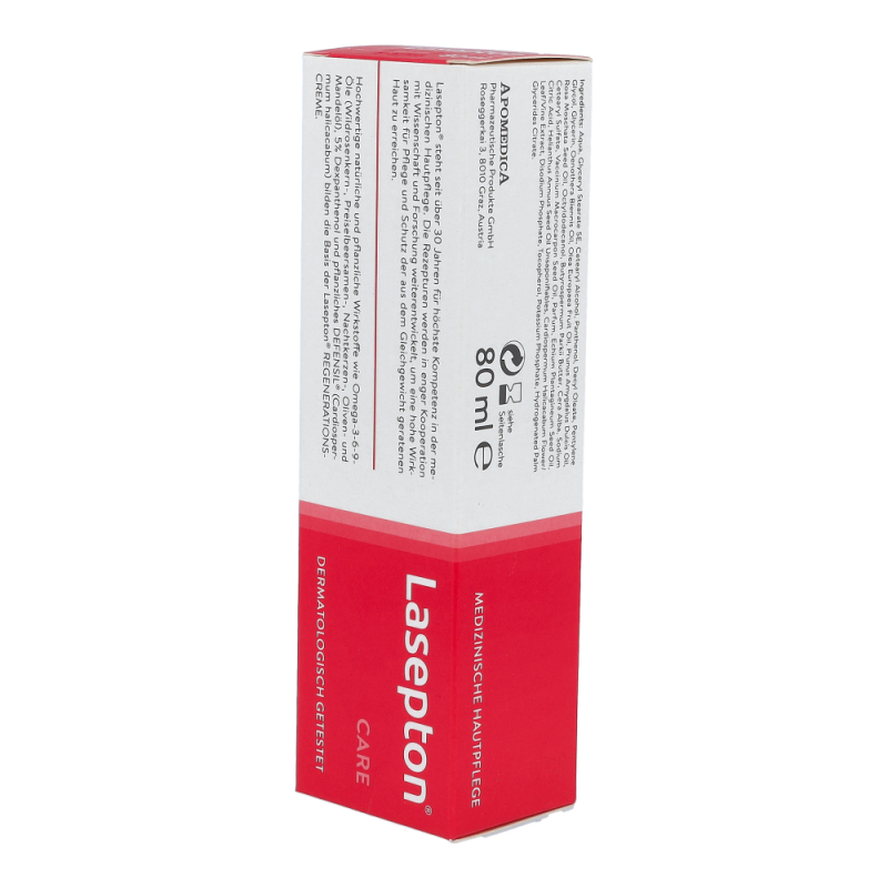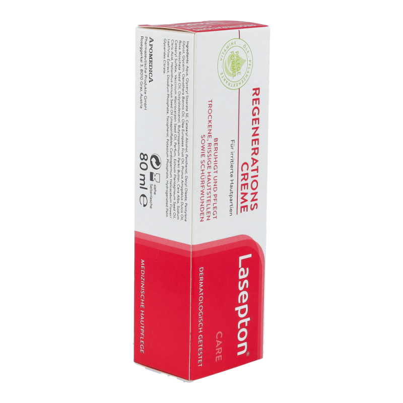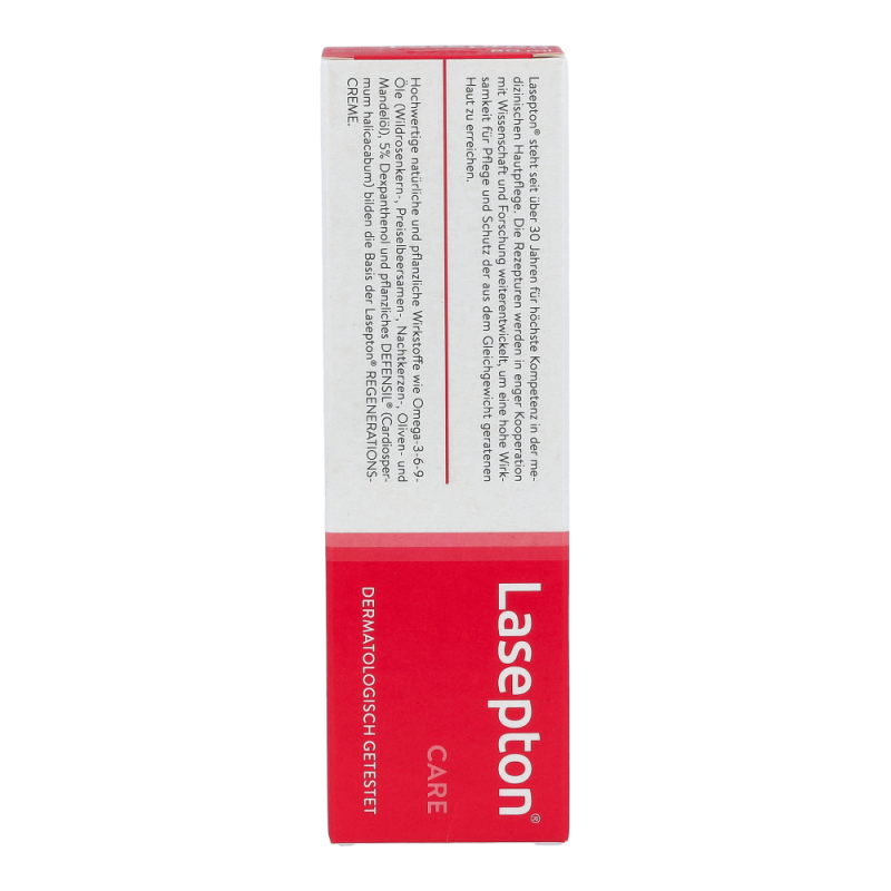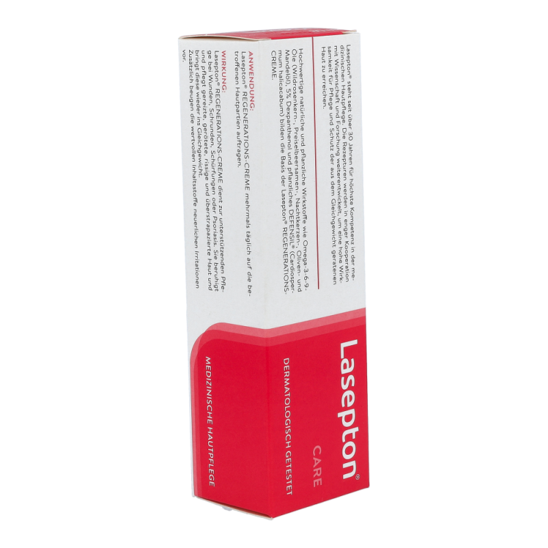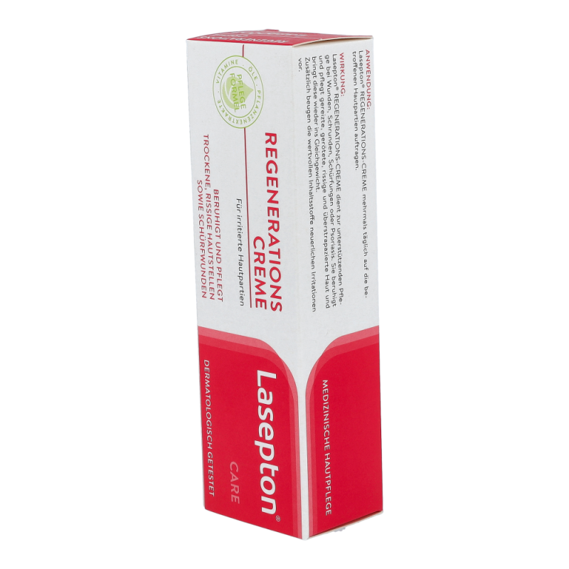 Die Lasepton® Regenerations-Creme bringt gereizte, gerötete und überstrapazierte Haut, z.B. an Händen, Ellbogen oder Beinen, wieder ins Gleichgewicht. Sie unterstützt die Regeneration der obersten Hautschichten und beugt neuerlichen Irritationen vor.