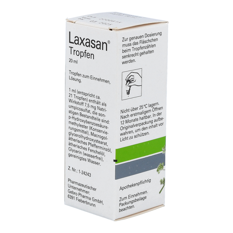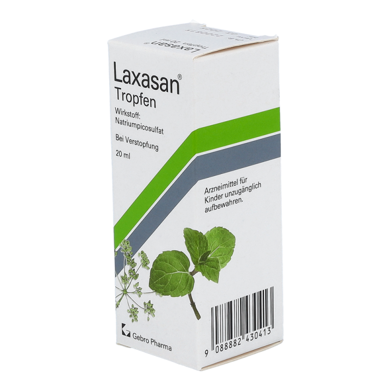 Laxasan® Tropfen sind ein Abführmittel, das in schonender Weise den natürlichen Entleerungsprozess im Dickdarm anregt. Das Stuhlvolumen vergrößert sich und der Stuhl wird dünnflüssiger.