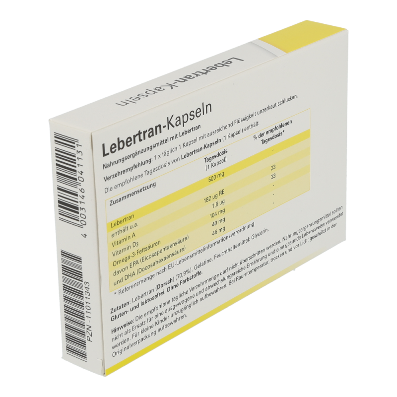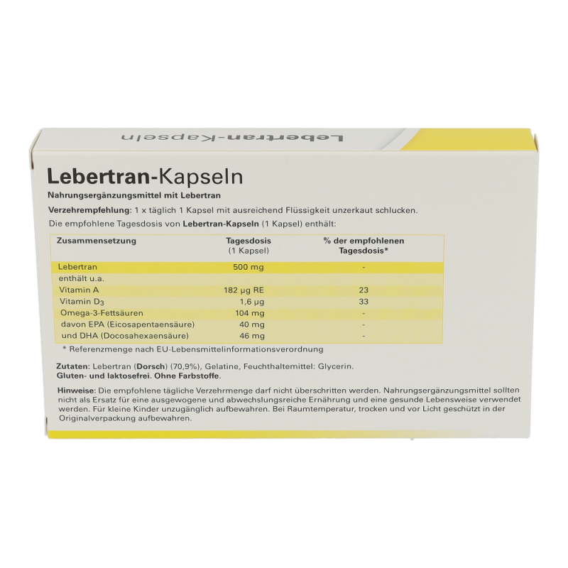 Zutaten: Lebertran (Dorsch) (70,9%), Gelatine, Feuchthaltemittel: Glycerin.