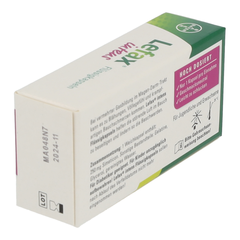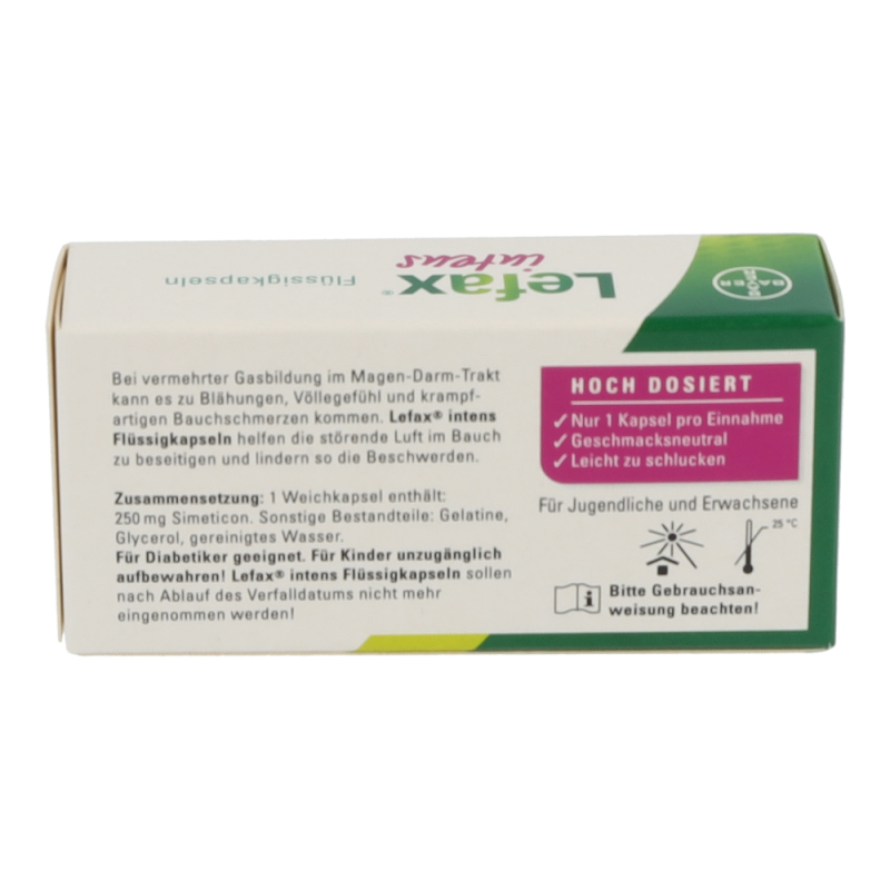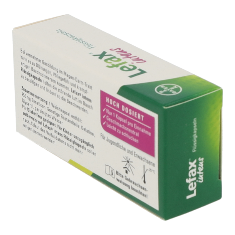 Lefax® intens ist das höchst dosierte Lefax®-Produkt und hilft daher besonders bei stärkeren Beschwerden. Das Anwendungsgebiet umfasst die Linderung und Behandlung von gasbedingten Magen-Darm-Beschwerden wie Blähungen (Meteorismus), Völlegefühl, krampfartigen Bauchschmerzen oder Aufstoßen. Ebenfalls wird es zur Vorbereitung von diagnostischen Untersuchungen im Bauchbereich herangezogen, zum Beispiel vor einer Röntgenuntersuchung oder einer Endoskopie.