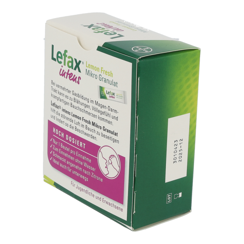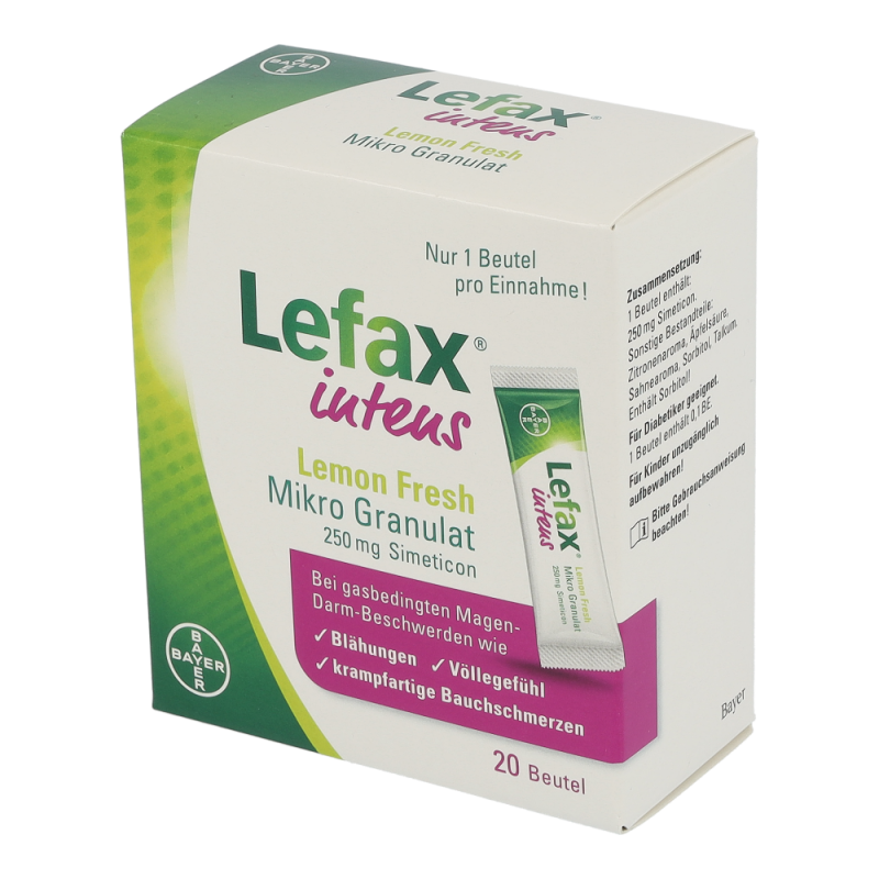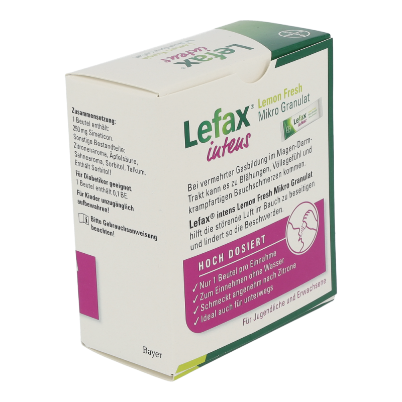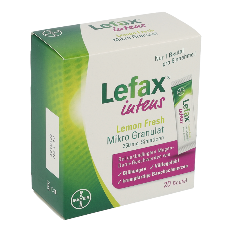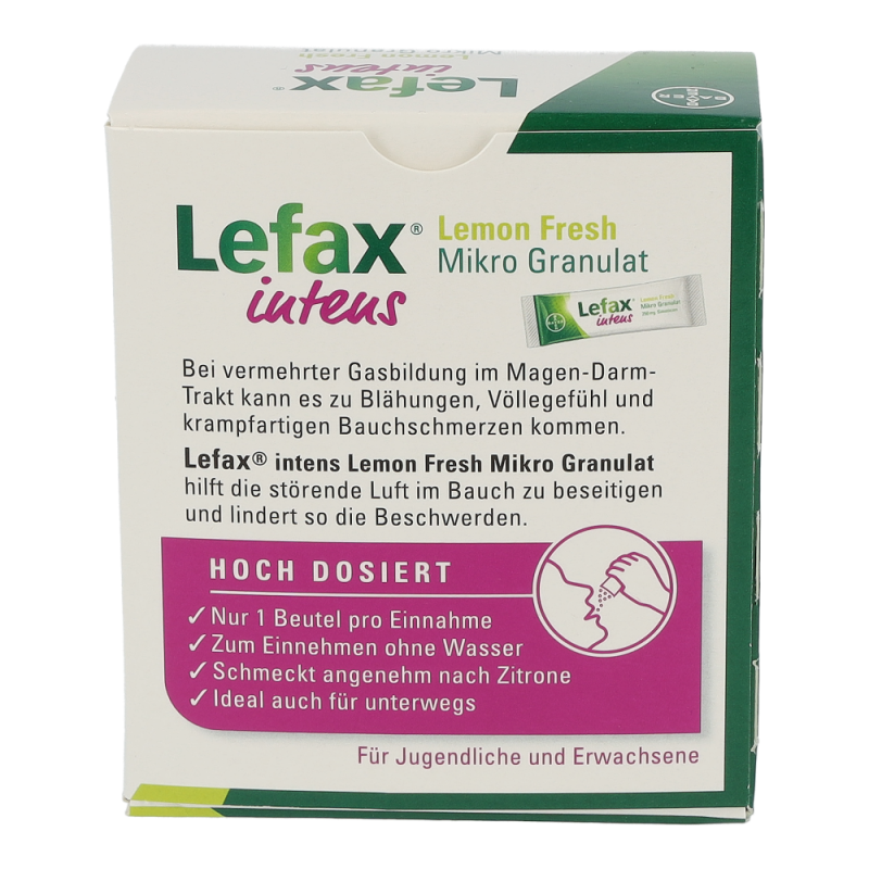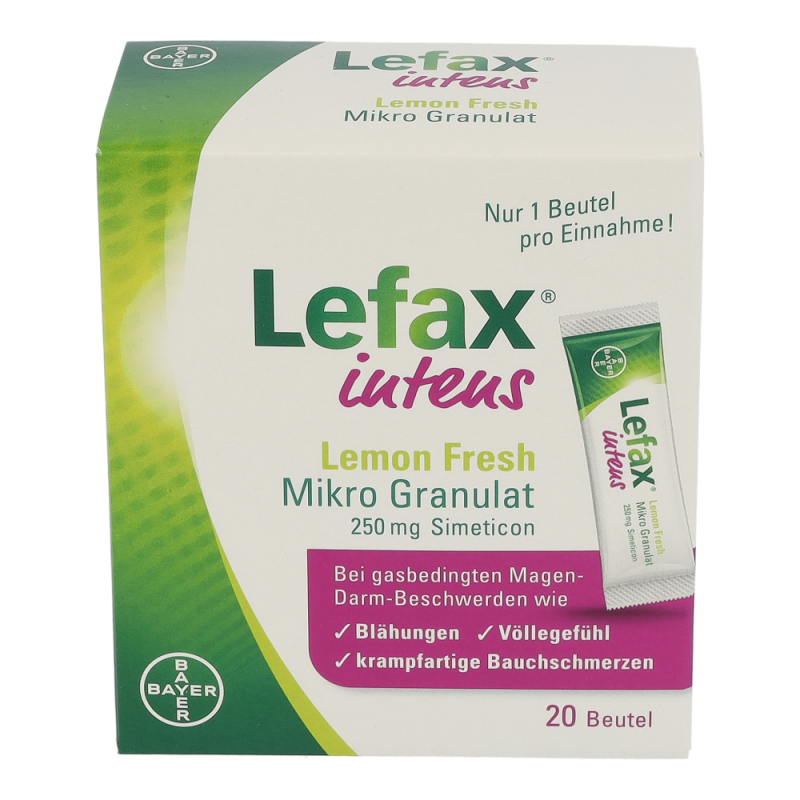 Lefax® intens ist das höchst dosierte Lefax®-Produkt und hilft daher besonders bei stärkeren Beschwerden. Das Anwendungsgebiet umfasst die Linderung und Behandlung von gasbedingten Magen-Darm-Beschwerden wie Blähungen (Meteorismus), Völlegefühl, krampfartigen Bauchschmerzen oder Aufstoßen. Ebenfalls wird es zur Vorbereitung von diagnostischen Untersuchungen im Bauchbereich herangezogen, zum Beispiel vor einer Röntgenuntersuchung oder einer Endoskopie.