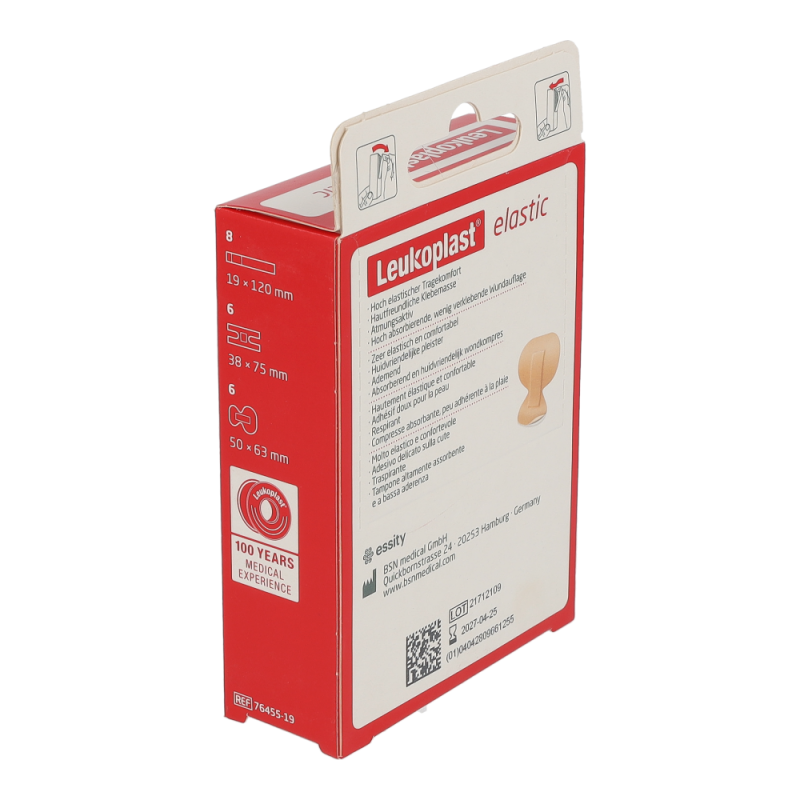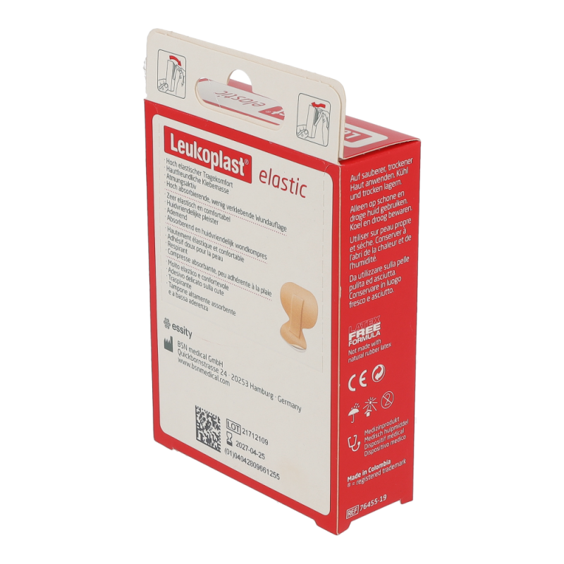 Leukoplast Elastic Strip ist besonders flexibel, elastisch und bequem. Es klebt sogar oben auf Gelenken, Fingern und anderen Körperteilen, die Sie viel bewegen. Zuverlässige Haftfestigkeit sorgt auch bei starker Schweißbildung dafür, dass das Pflaster klebt.