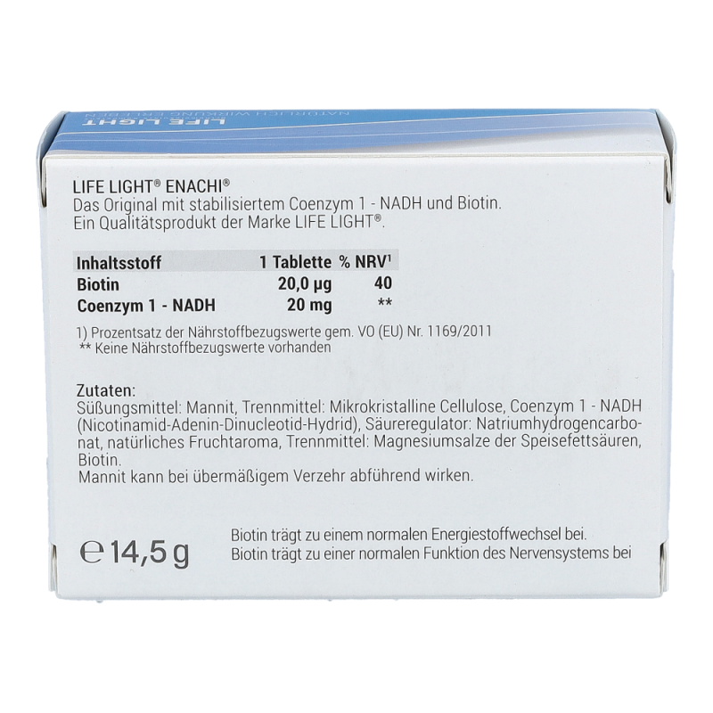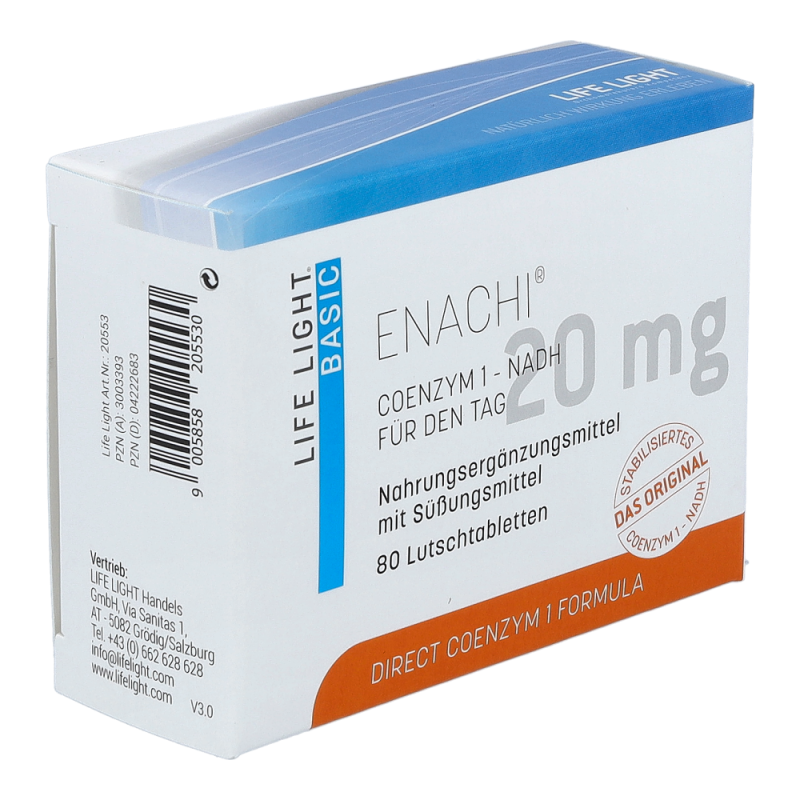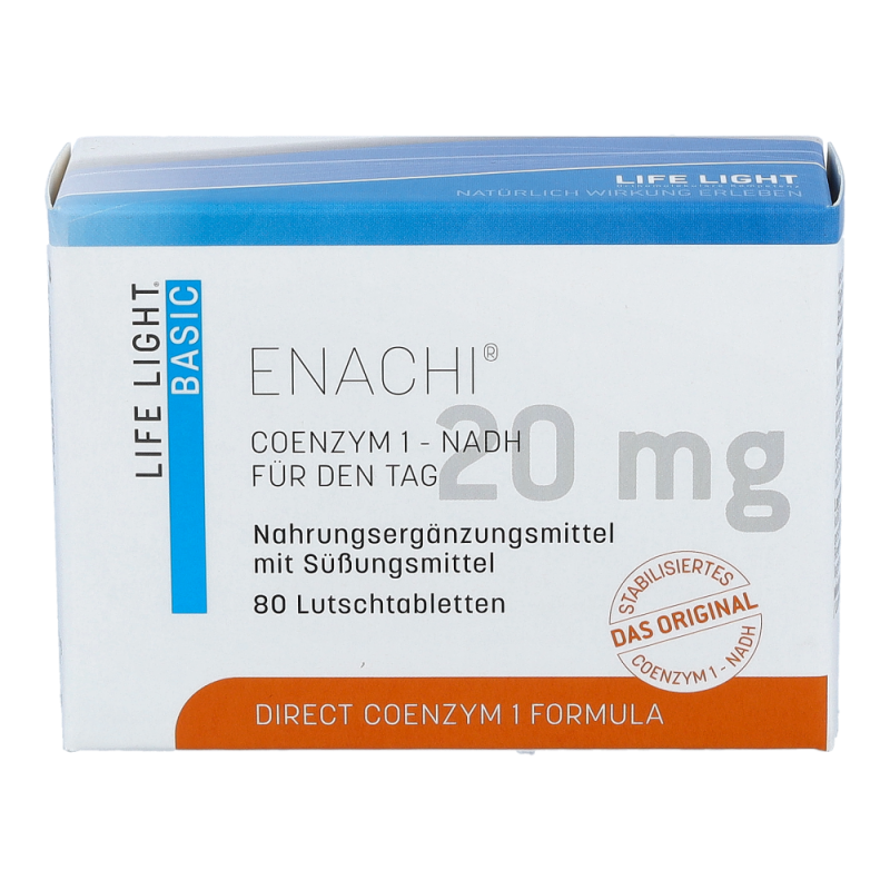 Life Light Enachi NADH Lutschtabletten sind ist wichtig für die Energieproduktion und die Immunabwehr des Körpers. NADH ist maßgeblich an der Energieproduktion von Zellen beteiligt. Besonders hoch ist die NADH-Konzentration in Organen, die Höchstleistungen erbringen müssen. Dazu zählen etwas Gehirn, Herz und Muskulatur.