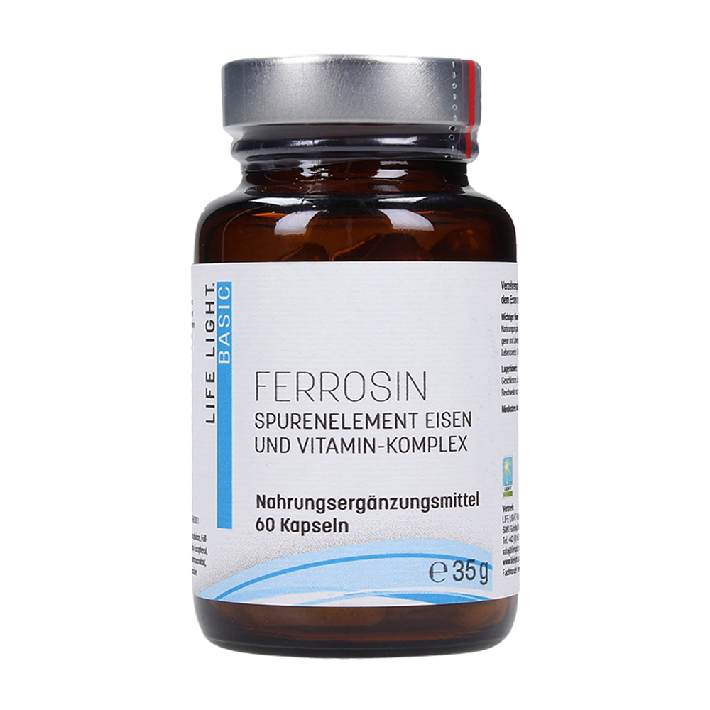 Life Light Ferrosin Eisen Kapseln sind ein orthomolekularer Mikronährstoffkomplex mit organischem Eisengluconat. Eisen trägt insbesondere zum normalen Sauerstofftransport im Körper sowie mit den zugesetzten Vitaminen B2, B3, B5, B6, B12 und C zu einem normalen Energiestoffwechsel und zur Verringerung von Müdigkeit und Ermüdung bei.