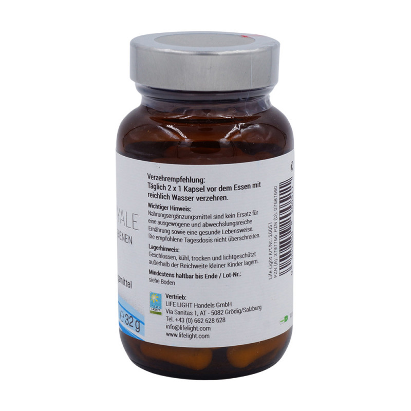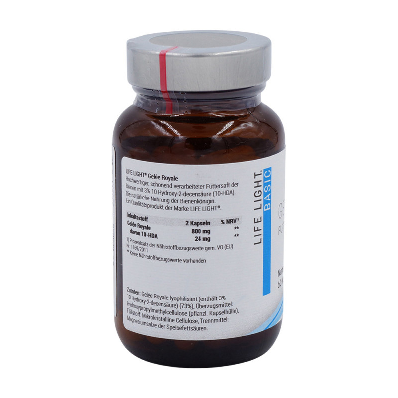 Life Light Gelee Royal Kapseln enthalten hochwertiges, schonend verarbeitetes Bienensekret, welches die natürlichen Abwehrkräfte unterstützt. Gelee Royal enthält ein außerordentlich breites Spektrum an Aminosäuren, Proteinen, Vitaminen, Mineralstoffen und Spurenelementen und hilft dem Körper daher in verschiedensten Funktion.