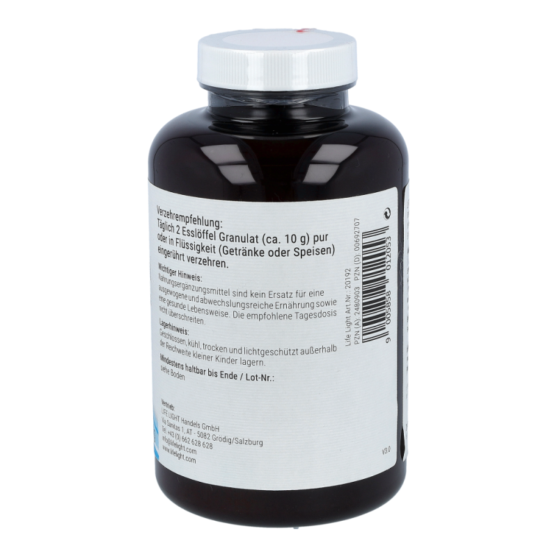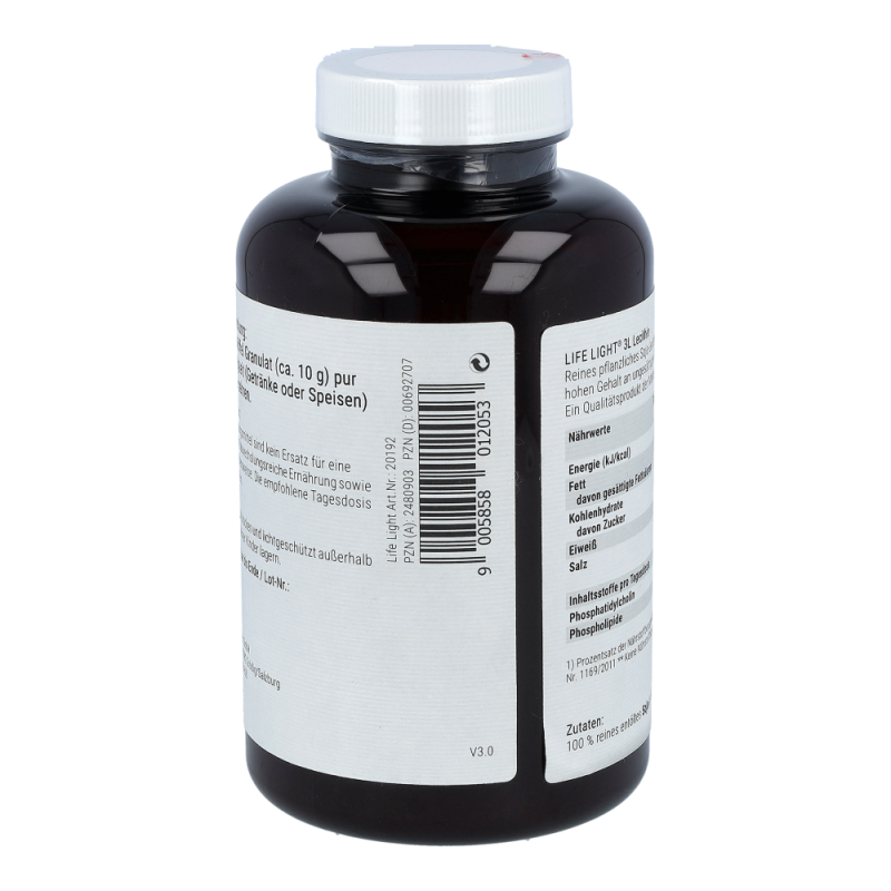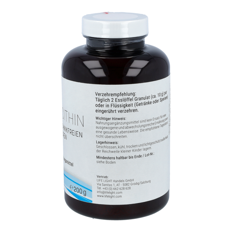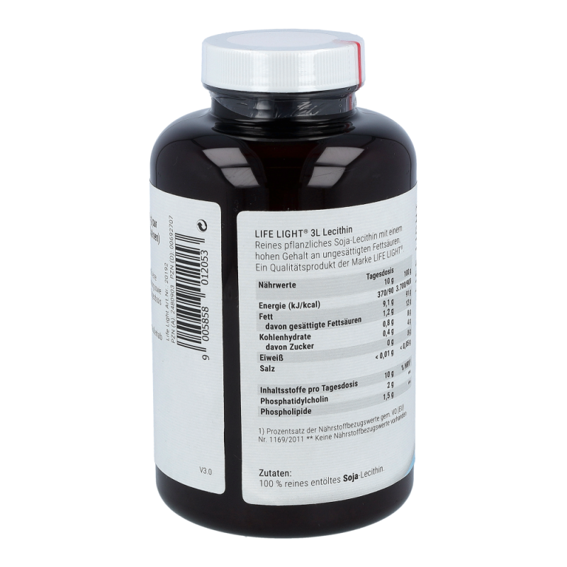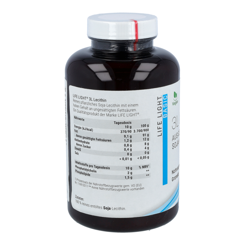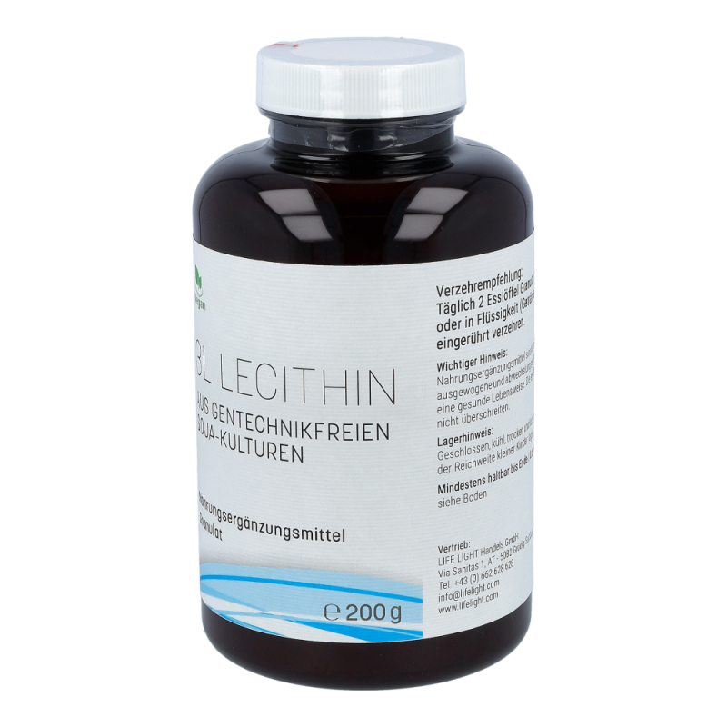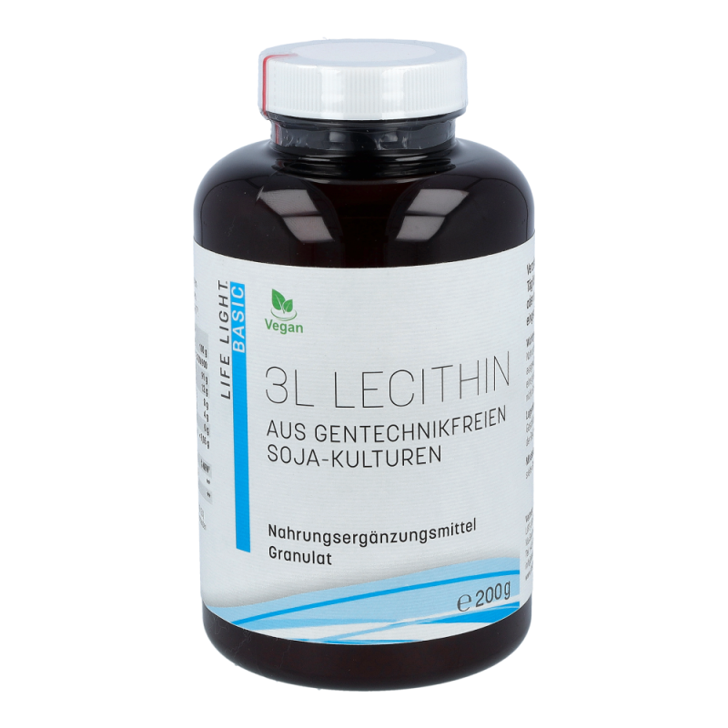 Life Light Lecithin 3L Granulat enthält 100 % reines Lecithin aus der Sojabohne als nachwachsendem Rohstoff. Lecithin gehört zu den Phospholipiden, speziell zu den Phosphatidylchinolinen und besteht aus Fettsäuren, Cholin, Phosphorsäure und Glycerin. Durch die Abtrennung von überschüssigem Öl aus dem Rohlecithin entsteht ein gut dosierbares Granulat.