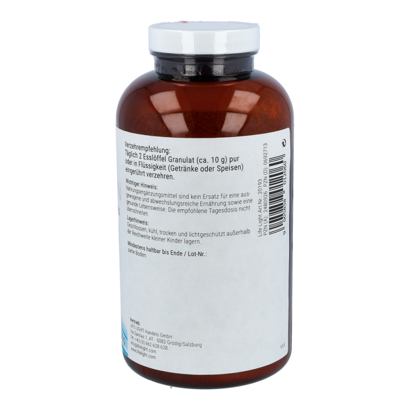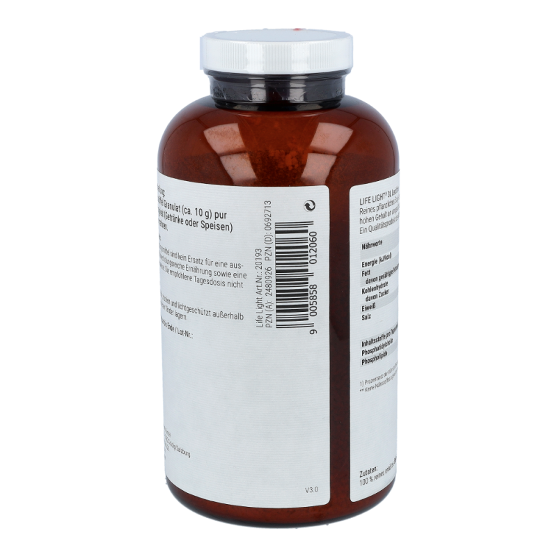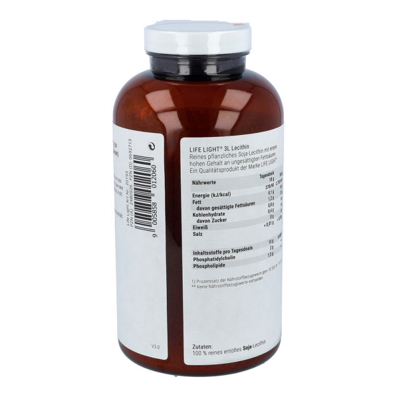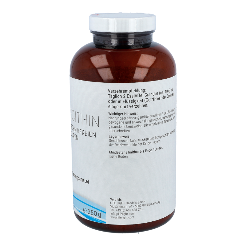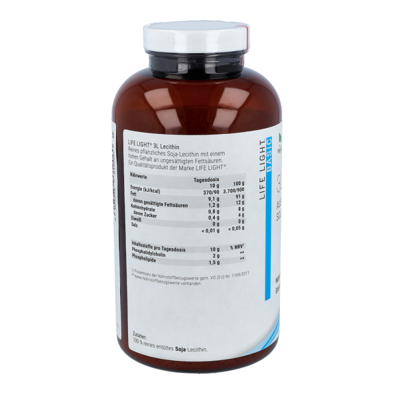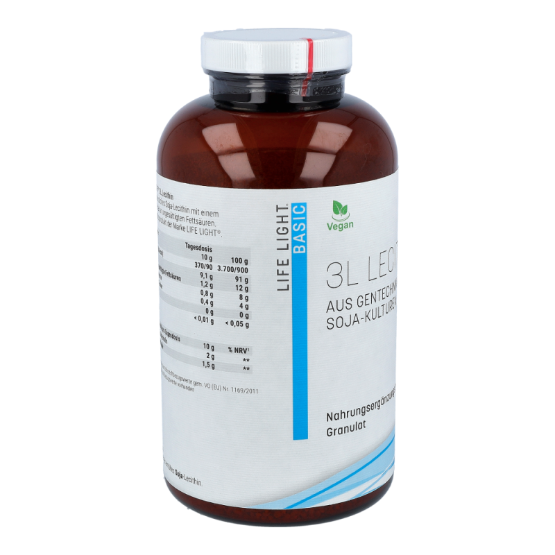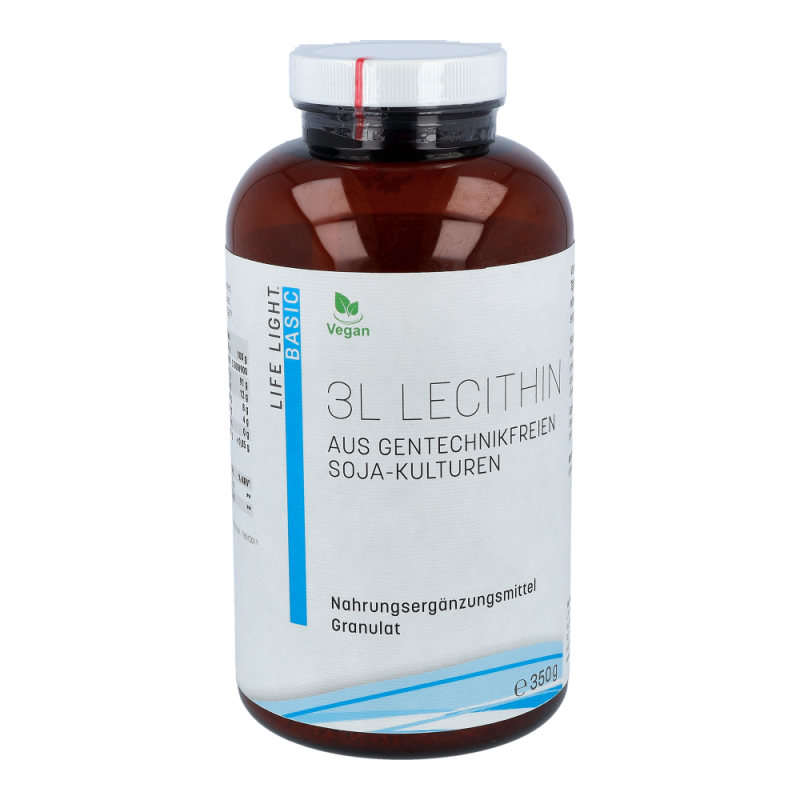 Life Light Lecithin 3L Granulat enthält 100 % reines Lecithin aus der Sojabohne als nachwachsendem Rohstoff. Lecithin gehört zu den Phospholipiden, speziell zu den Phosphatidylchinolinen und besteht aus Fettsäuren, Cholin, Phosphorsäure und Glycerin. Durch die Abtrennung von überschüssigem Öl aus dem Rohlecithin entsteht ein gut dosierbares Granulat..