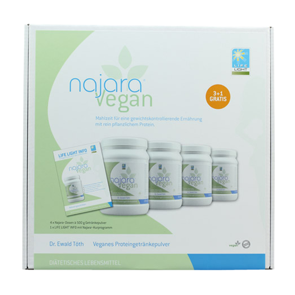 Najara Vegan Pulver 3+1 Lifelight ist ideal für eine kalorienarme Ernährung zur Gewichtsverringerung und begleitend zu diätetischen Anwendungen. Die besondere Nährstoffzusammensetzung ist geeignet, um eine Mahlzeit zu ersetzen.