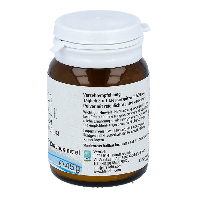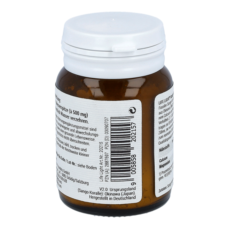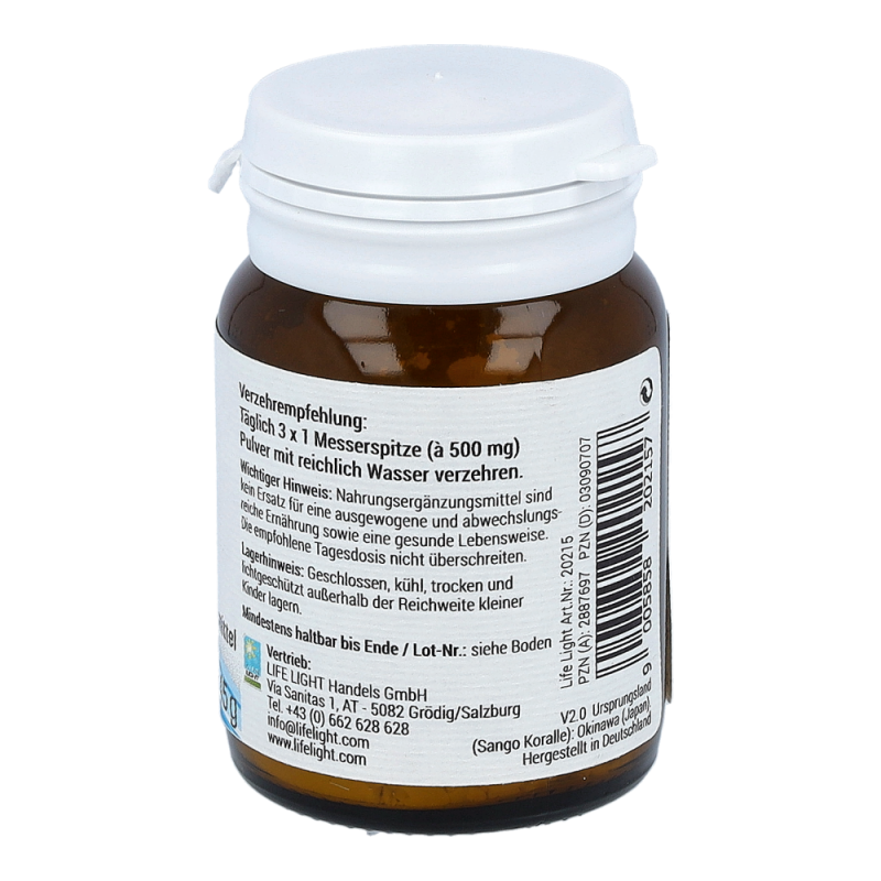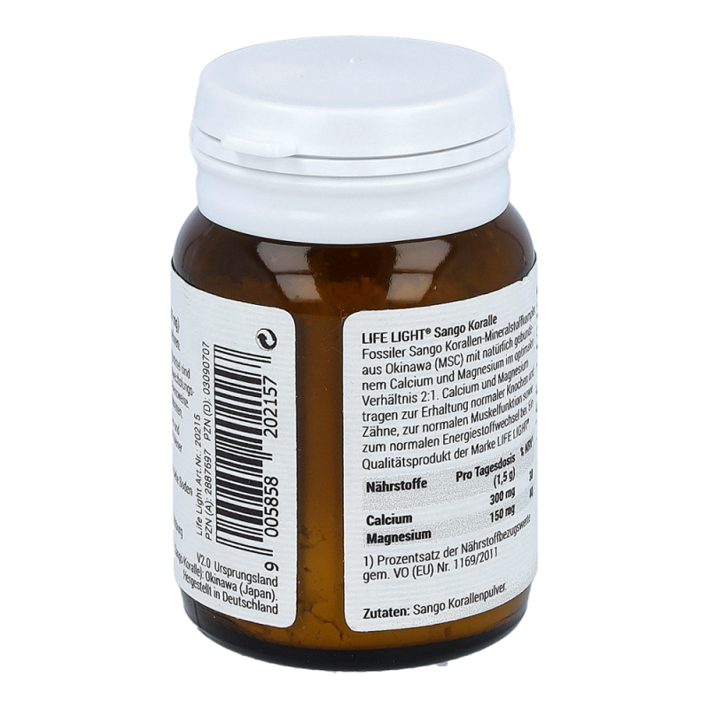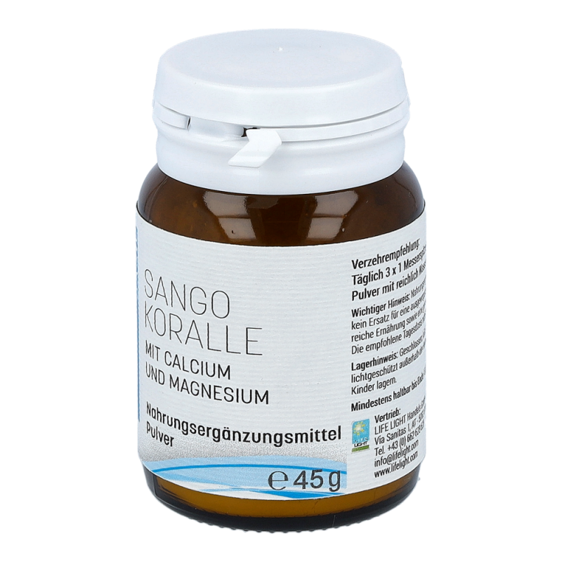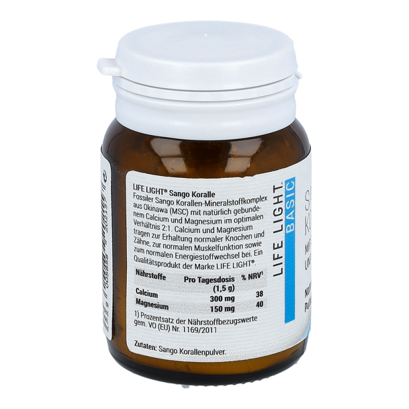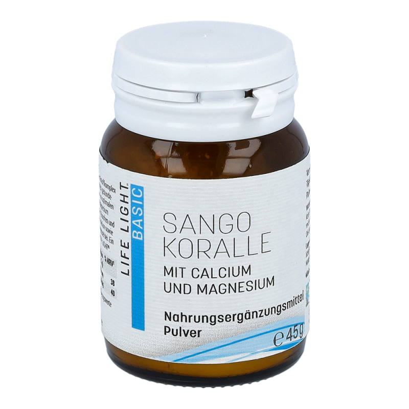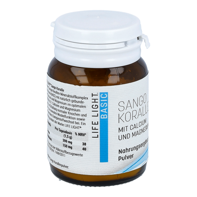 Life Light Pulver Sango Koralle überzeugt durch sein außerordentlich hohes Gehalt an Calcium und Magnesium. Calcium trägt zu einer normalen Blutgerinnung, einer normalen Funktion von Verdauungsenzymen und einem normalen Energiestoffwechsel bei. Magnesium dient zur Erhaltung normaler Knochen und Zähne und bewirkt darüber hinaus die normale Funktion des Nervensystems.