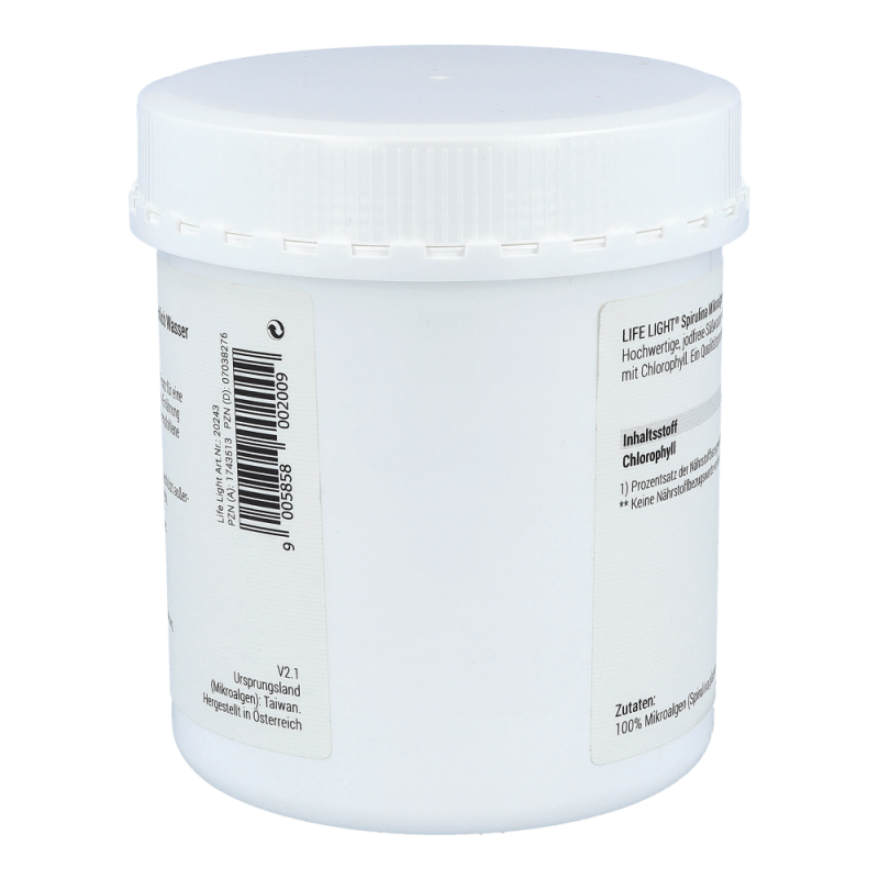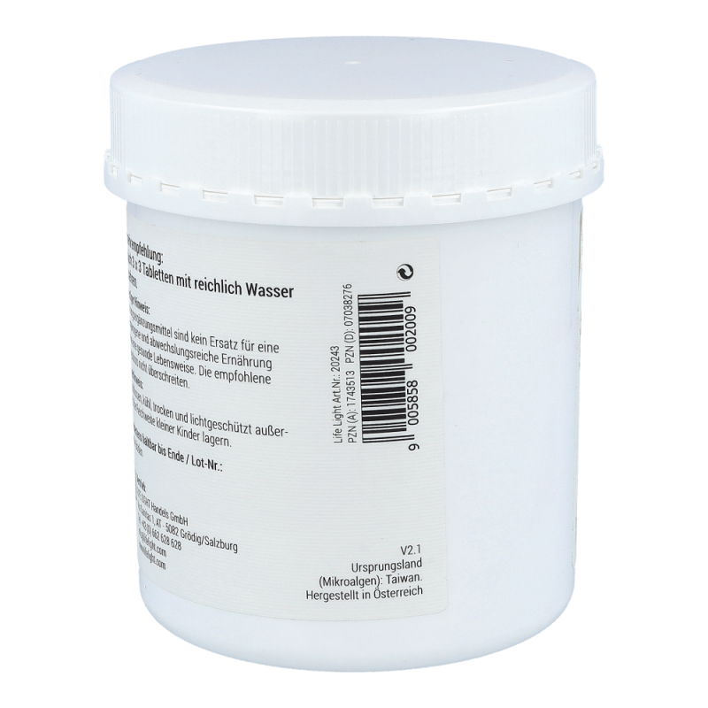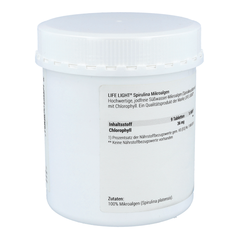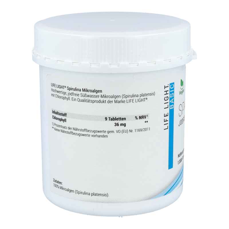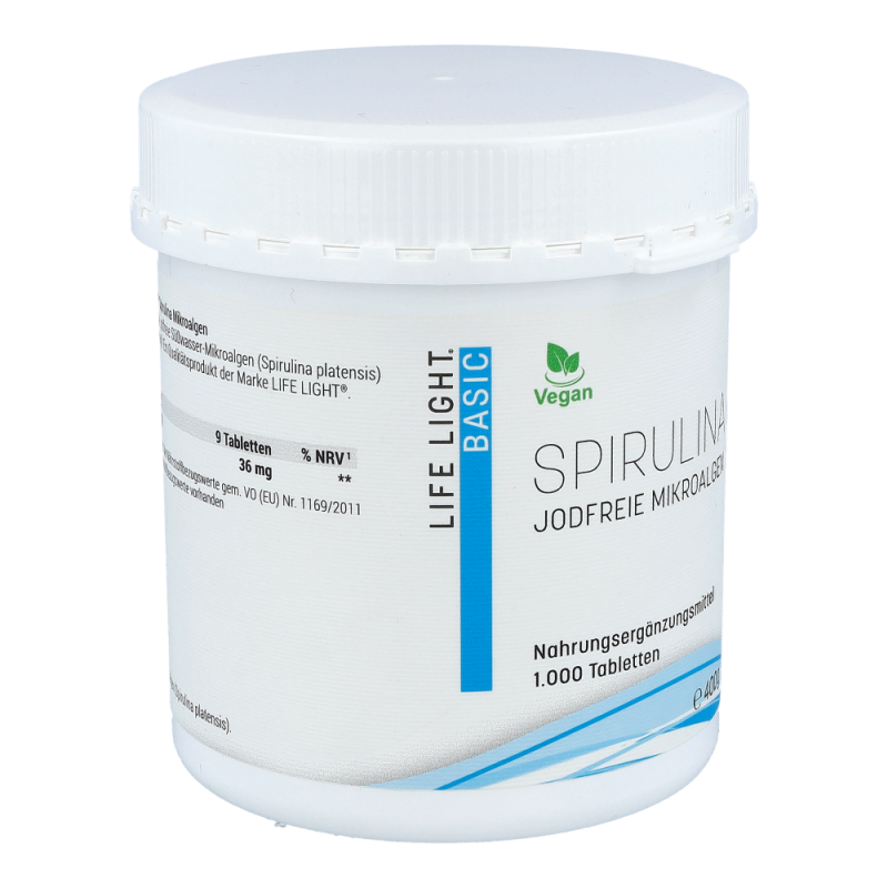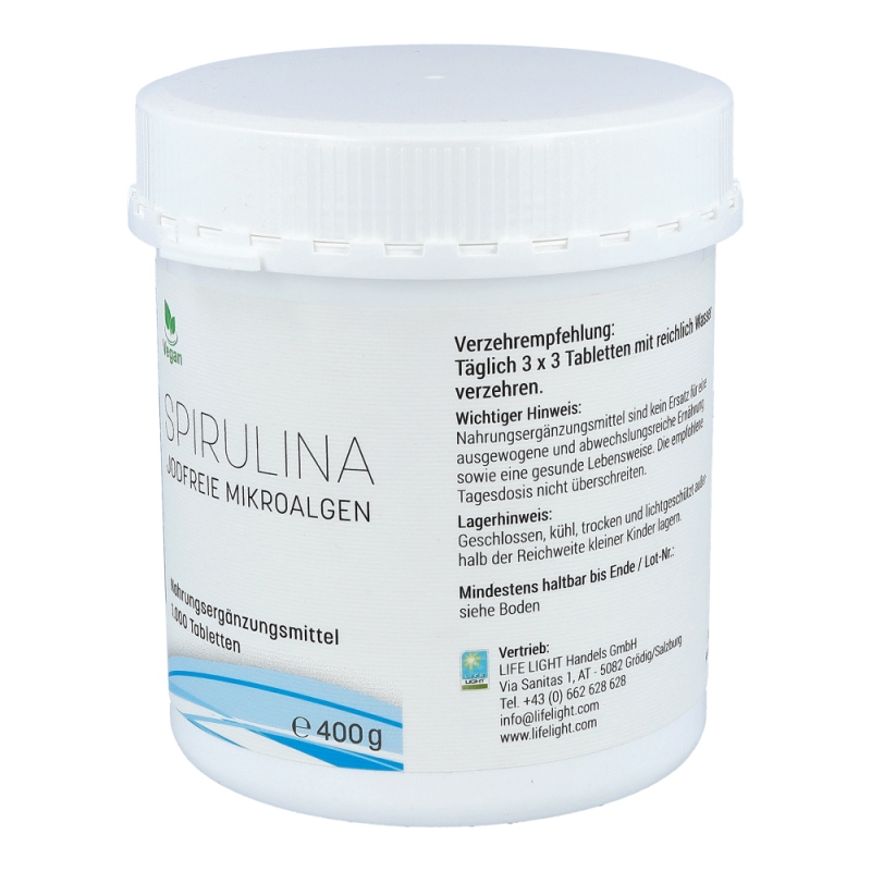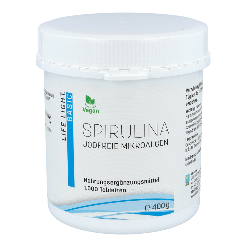 Microalgen Spirulina 400 mg Tabletten enthalten grüne, jodfreie Süßwasser-Mikroalgen mit organisch gebundenem Chlorophyll und Vitamin B12. Vitamin B12 trägt zu einer normalen Funktion des Nervensystems, einer normalen Bildung roter Blutkörperchen und einer Verringerung von Müdigkeit und Ermüdung bei. Außerdem leistet das Vitamin einen Beitrag zu einer normalen psychischen Funktion und einer normalen Funktion des Immunsystems.