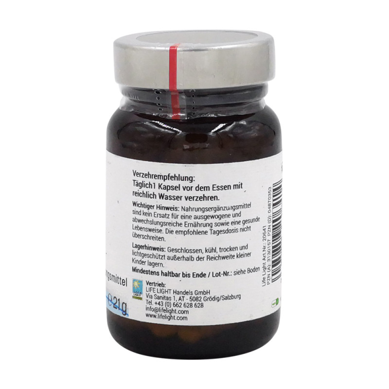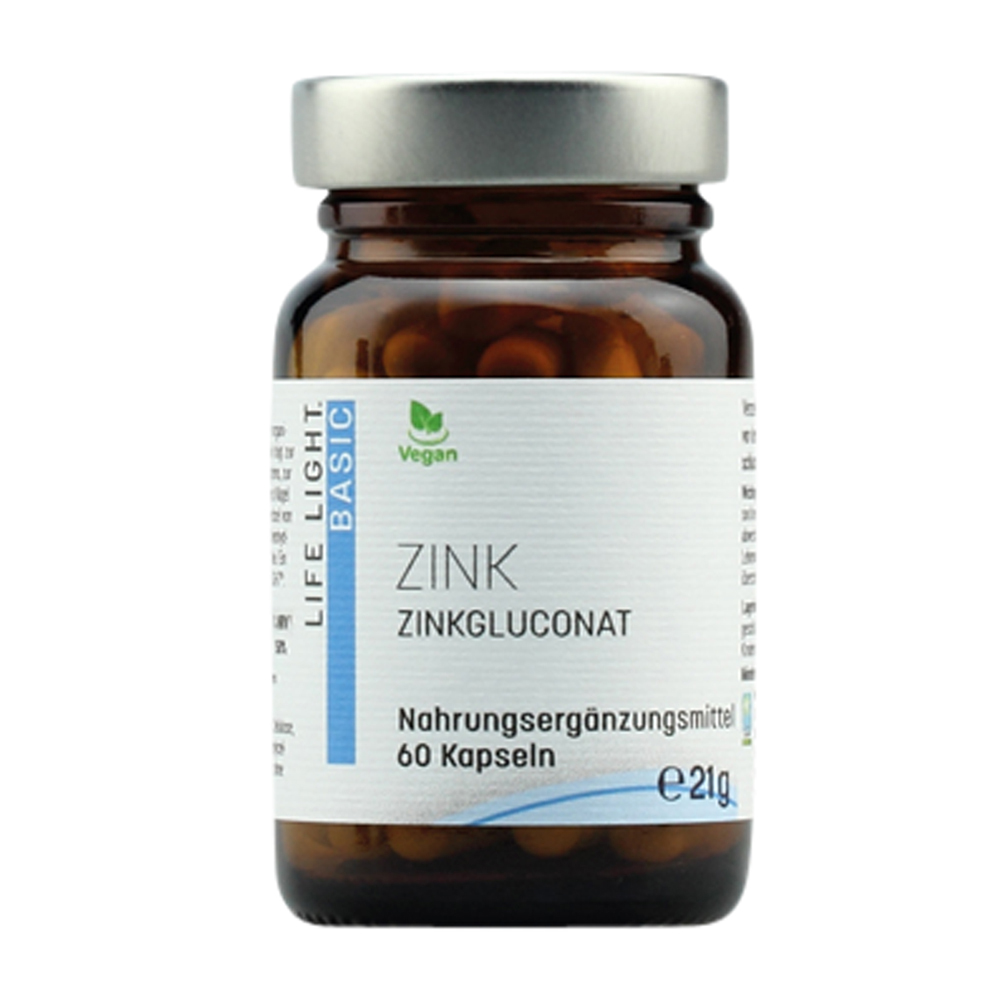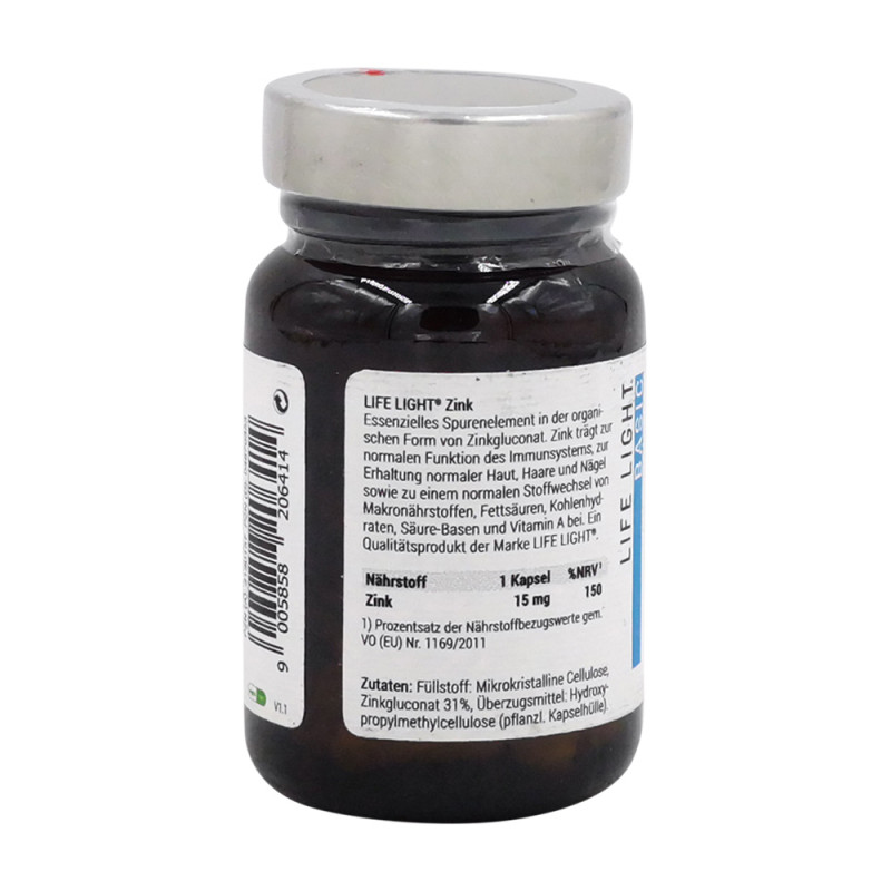 Life Light Zink Kapseln enthalten das essentielle Spurenelement Zink in organisch gebundener Form. Zink trägt zu einer normalen kognitiven Funktion, einer normalen DNA-Synthese sowie zur Erhaltung normaler Haut, Haare, Nägel und Knochen bei. Außerdem ist es wichtig für einen normalen Stoffwechsel des Vitamin A, der Fettsäuren sowie der Kohlenhydrate.