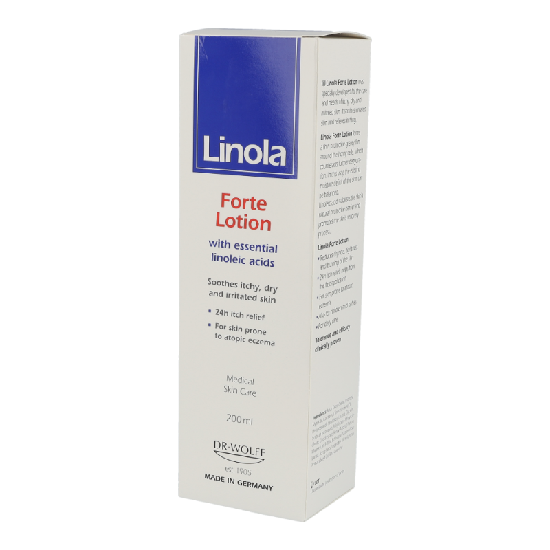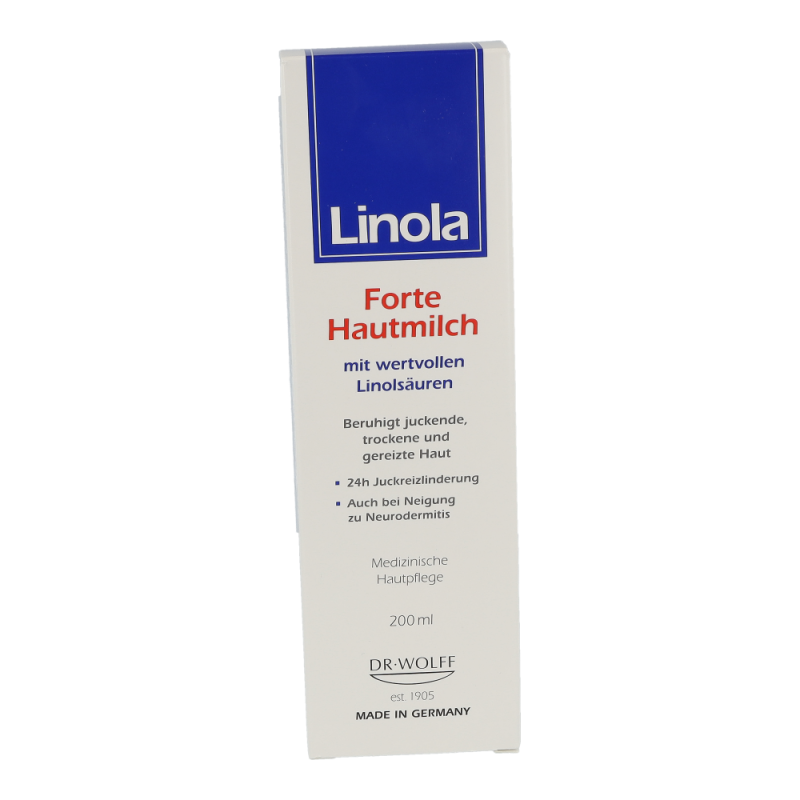 Die Linola Forte Hautmilch hilft dabei das vorhandene Fett- und Feuchtigkeitsdefizit der Haut wieder auszugleichen. Sie enthält wertvolle Linolsäuren, die den natürlichen Hautschutz stabilisieren und fördert so den Regenerationsprozess der Haut. Sie pflegt trockene und gereizte Haut intensiv und bildet einen dünnen schützenden Film um die Hornzellen aus. Juckreiz wird so bereits ab der ersten Anwendung reduziert.