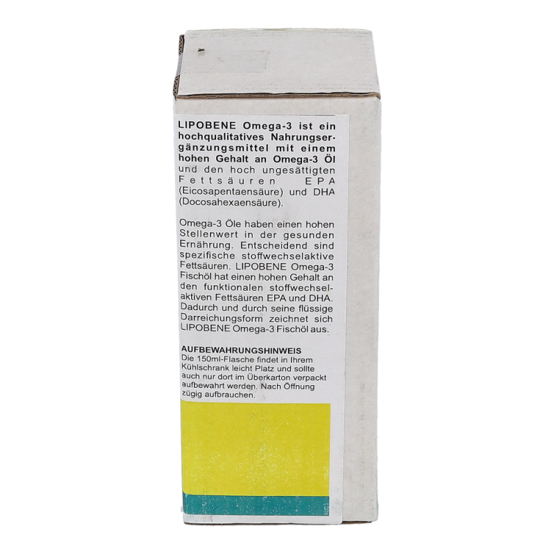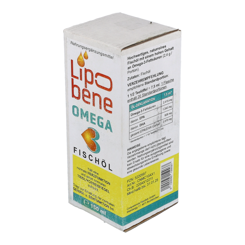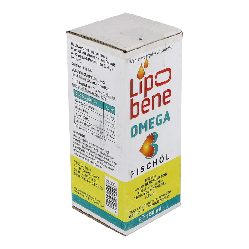 LIPOBENE Omega-3 Öl enthält hochdosiert die stoffwechselaktiven Fettsäuren EPA (Eicosapentaensäure) und DHA (Docosahexaensäure) und trägt so zu einer normalen Herzfunktion sowie zur Aufrechterhaltung eines normalen Triglyceridspiegels bei.