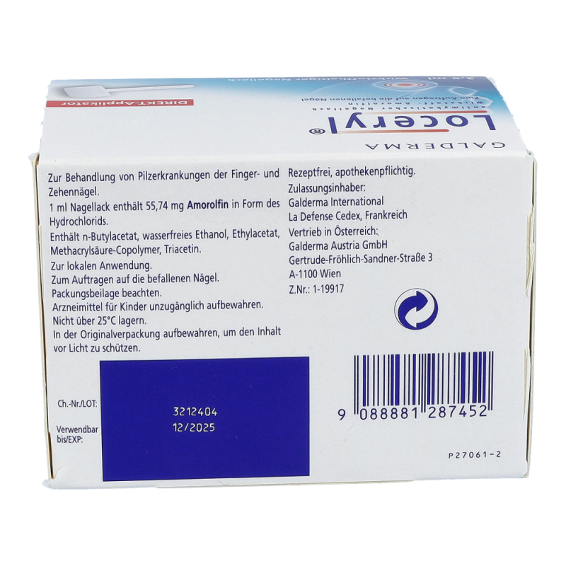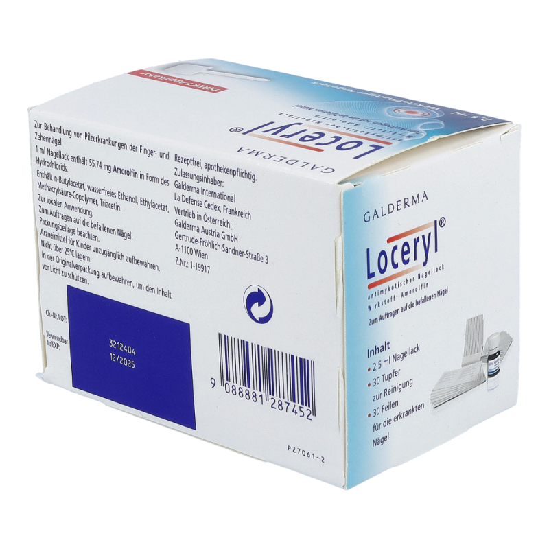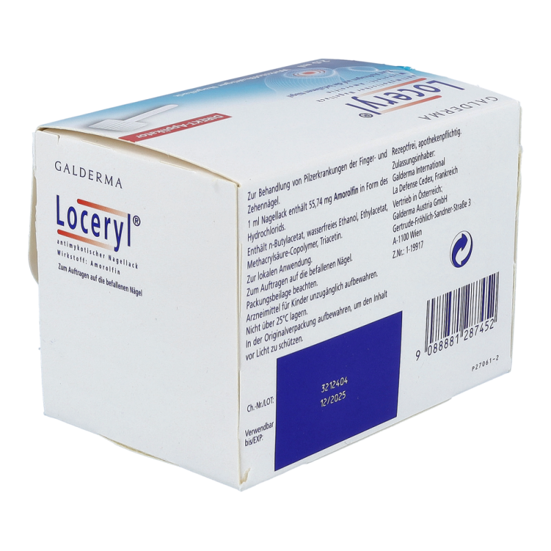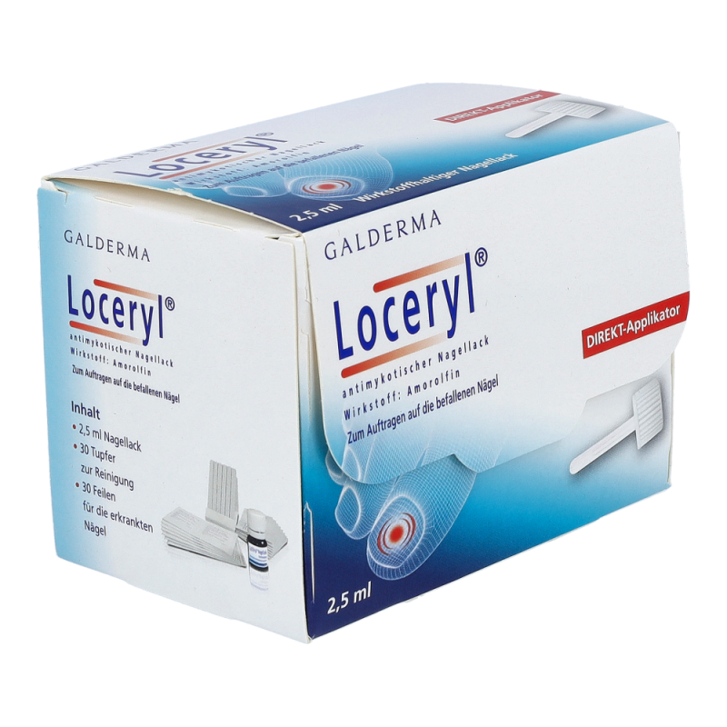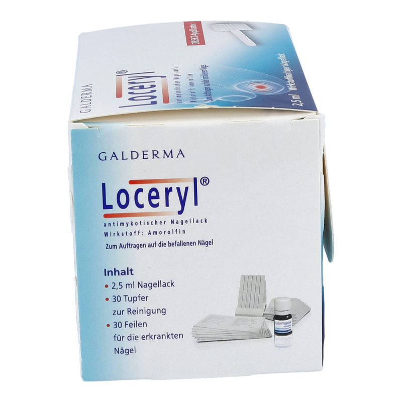 Loceryl antimykotischer Nagellack ist ein Arzneimittel zur Behandlung von Pilzerkrankungen der Finger- und Zehennägel. Loceryl wirkt gegen verschiedenste Amorolfin-empfindliche Pilzarten, wie Hefen, Hautpilze und Schimmelpilze. Der Nagellack hemmt das Wachstum der Pilze und tötet sie ab.